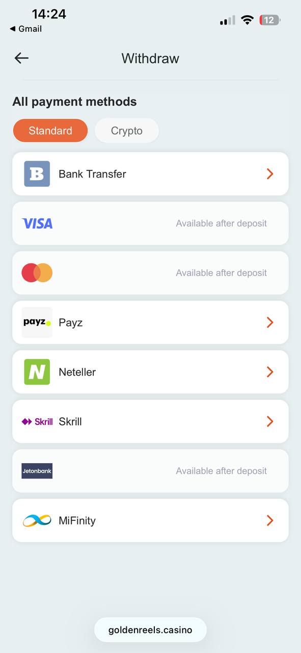Payout options: Visa, Bank Transfer, Skrill, Skrill 1-Tap, Neteller, Jeton...