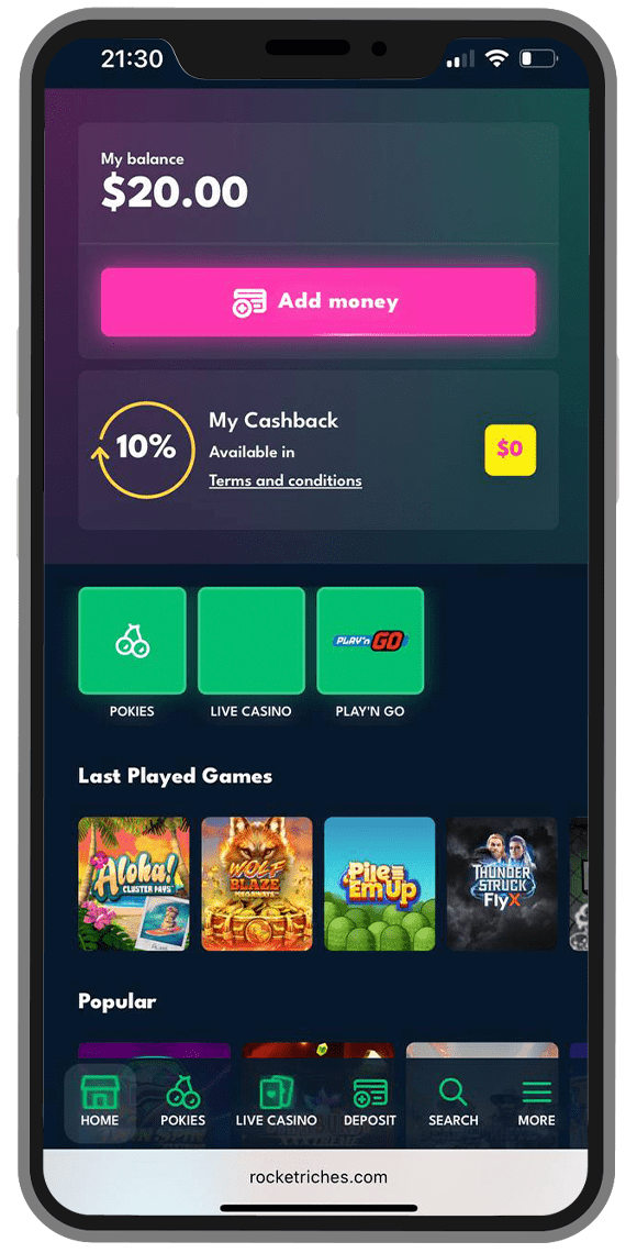 Rocket Riches pushes the aggression further: up to 20 % cashback calculated on a strict midnight-to-midnight window, claimable for roughly 24 hours the next day. I torched NZ $200 in Dead or Alive II on Sunday, clicked the banner Monday morning, and snagged NZ $40 back, but the refund carries wagering around 10 ×. Live-dealer games and sports bets don’t count, but I’m here for pokies anyway, so no harm done.