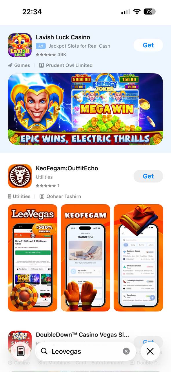 iOS: Search for the app on the store by typing the name of the online casino of your choice.