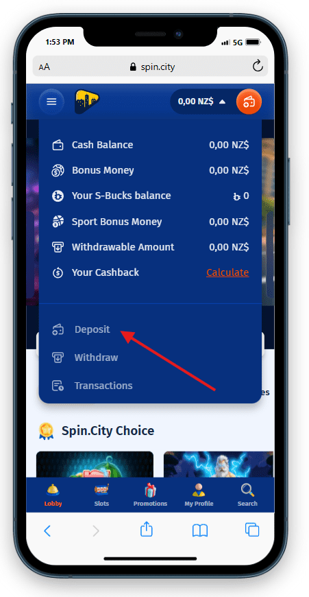 In the lobby header, tap your 0.00 NZ$ balance chip and choose Deposit.