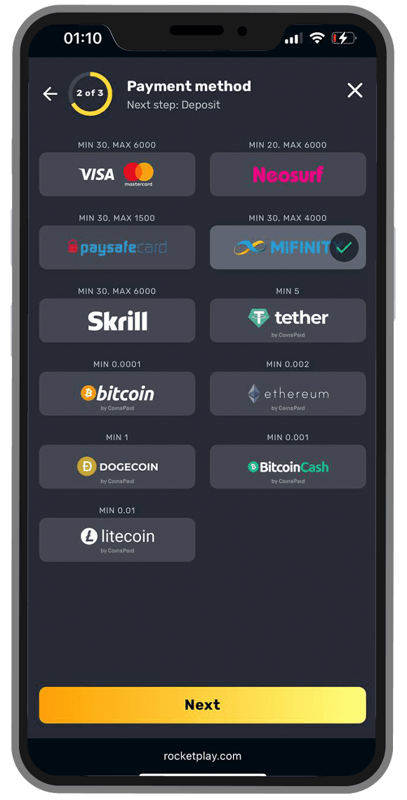 Deposit options: Visa, Mastercard, crypto, Bitcoin, USDT, Neosurf...
