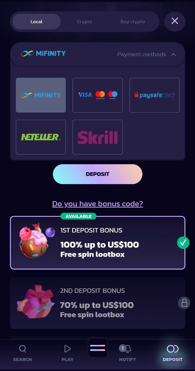 | Deposit options: | Visa, Mastercard, Maestro, Skrill, MiFinity, Neosurf, flexepin, paysafecard, Crypto (Ethereum, Litecoin, TRON, USDT (TRC20, ERC20), Ripple, Bitcoin Cash, Binance Coin, Bitcoin, Dogecoin), Changelly |