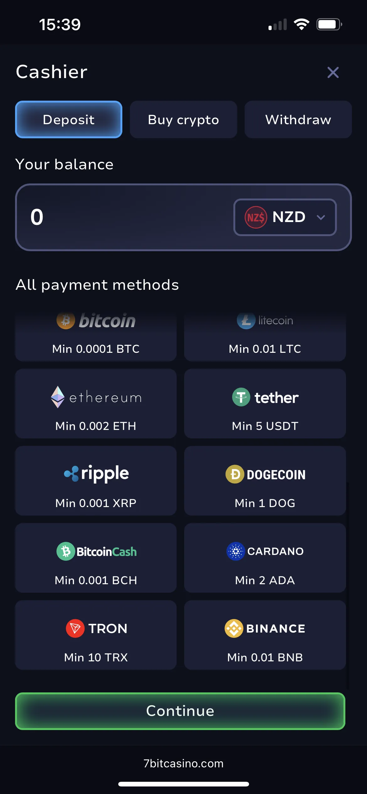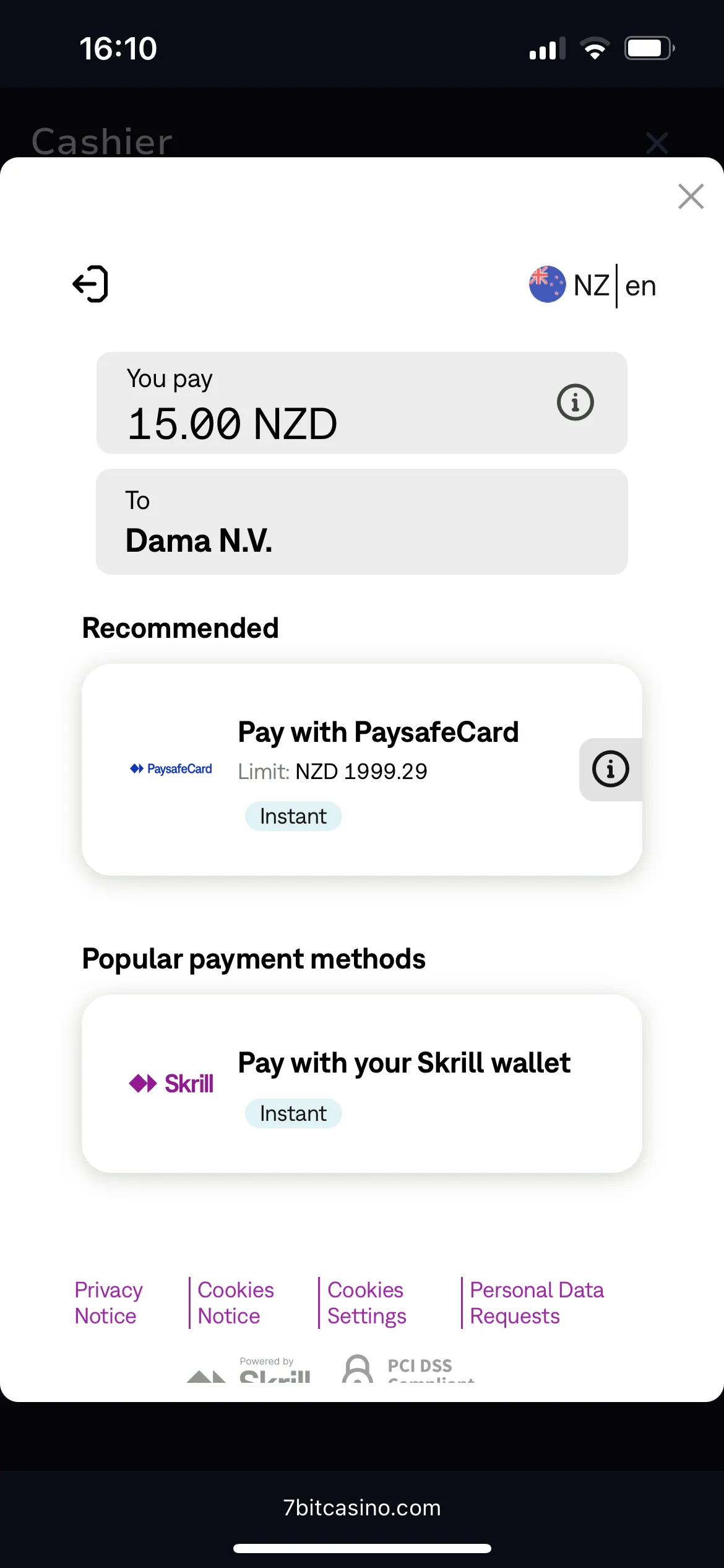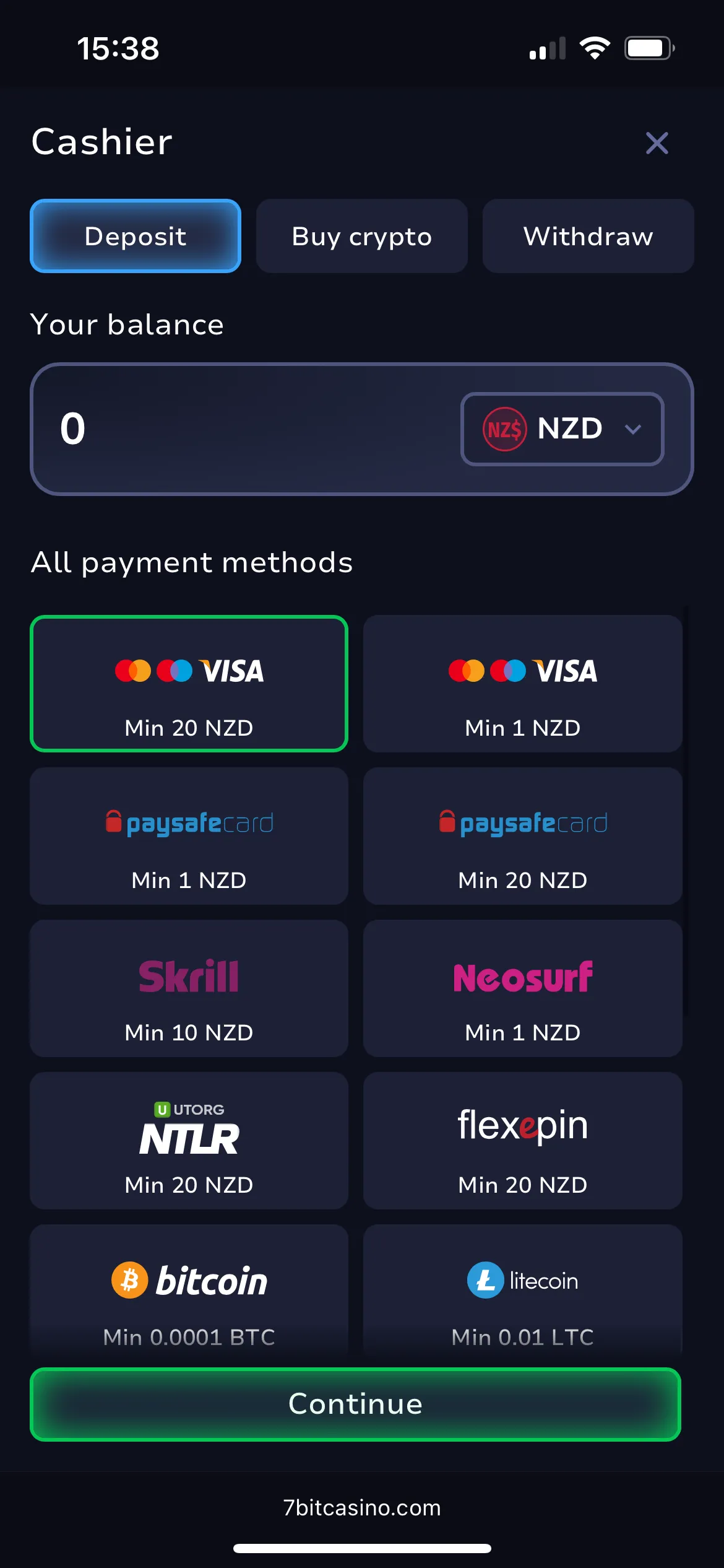 Deposits via Visa, Neosurf and PaySafeCard start at just NZD 1, while all other methods—Skrill, Neteller, Flexepin, and the remaining crypto rails—require higher minimum deposits. Withdrawals return to the same rail—and the same crypto address—within a day of verification. My BTC payout went to the blockchain in 45 minutes; a later Skrill withdrawal landed the same day. All transactions are SSL‑secured, and two‑factor toggles under Security give you a second PIN at every 7Bit Casino login.
