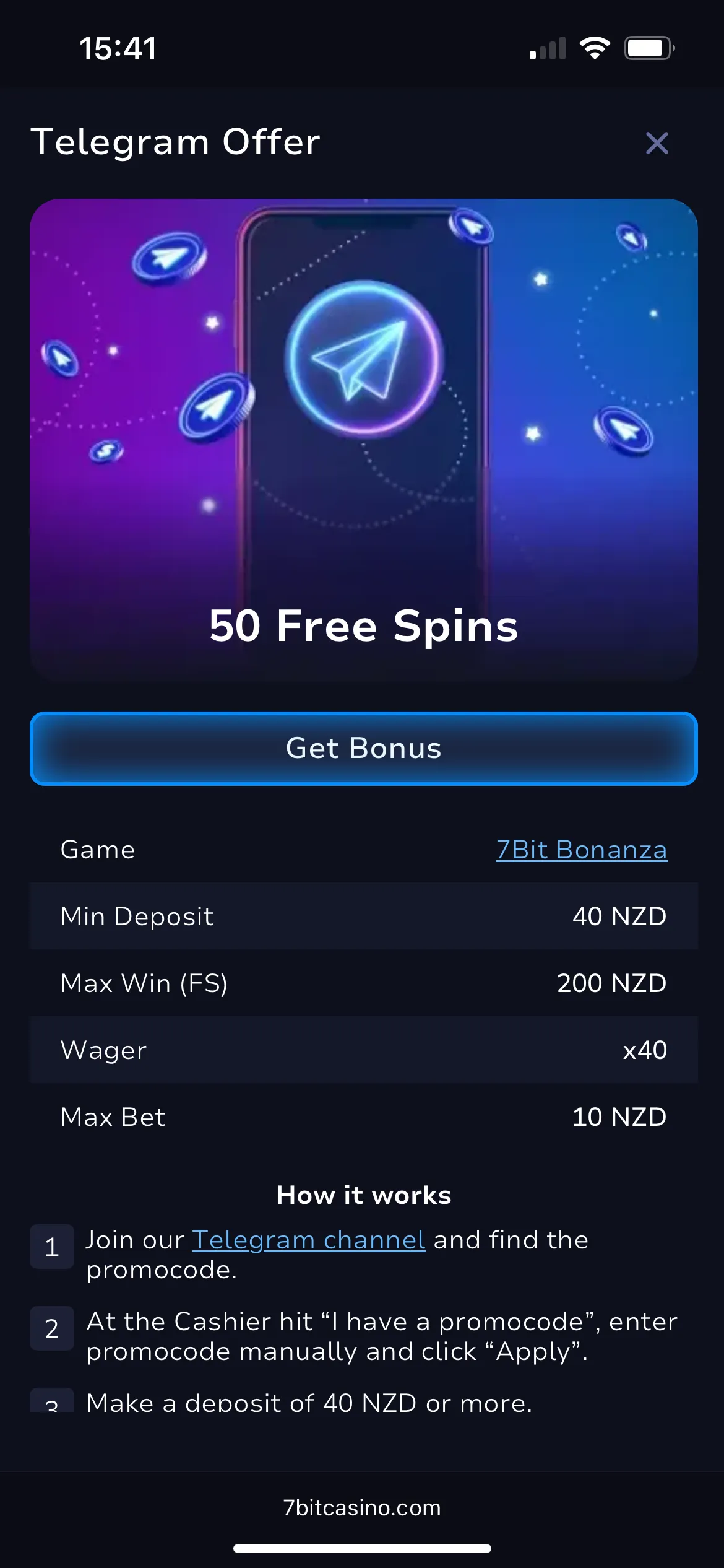 The headline promoter is a 100 % match to 800 NZD with 100 7Bit Casino free spins to Elvis Frog in Vegas. Min deposit is 40 NZD, but the actual floor of the website is NZD 1; that sounds almost like a 7Bit Casino no deposit bonus compared to most competitors—useful when you’re just testing volatility with micro wagers. Activation within the in-game bonus shop, My Bonuses, sees in-game money first, with bonus money going for a spin thereafter with a 35× bet and top bet maximum of 2 NZD.