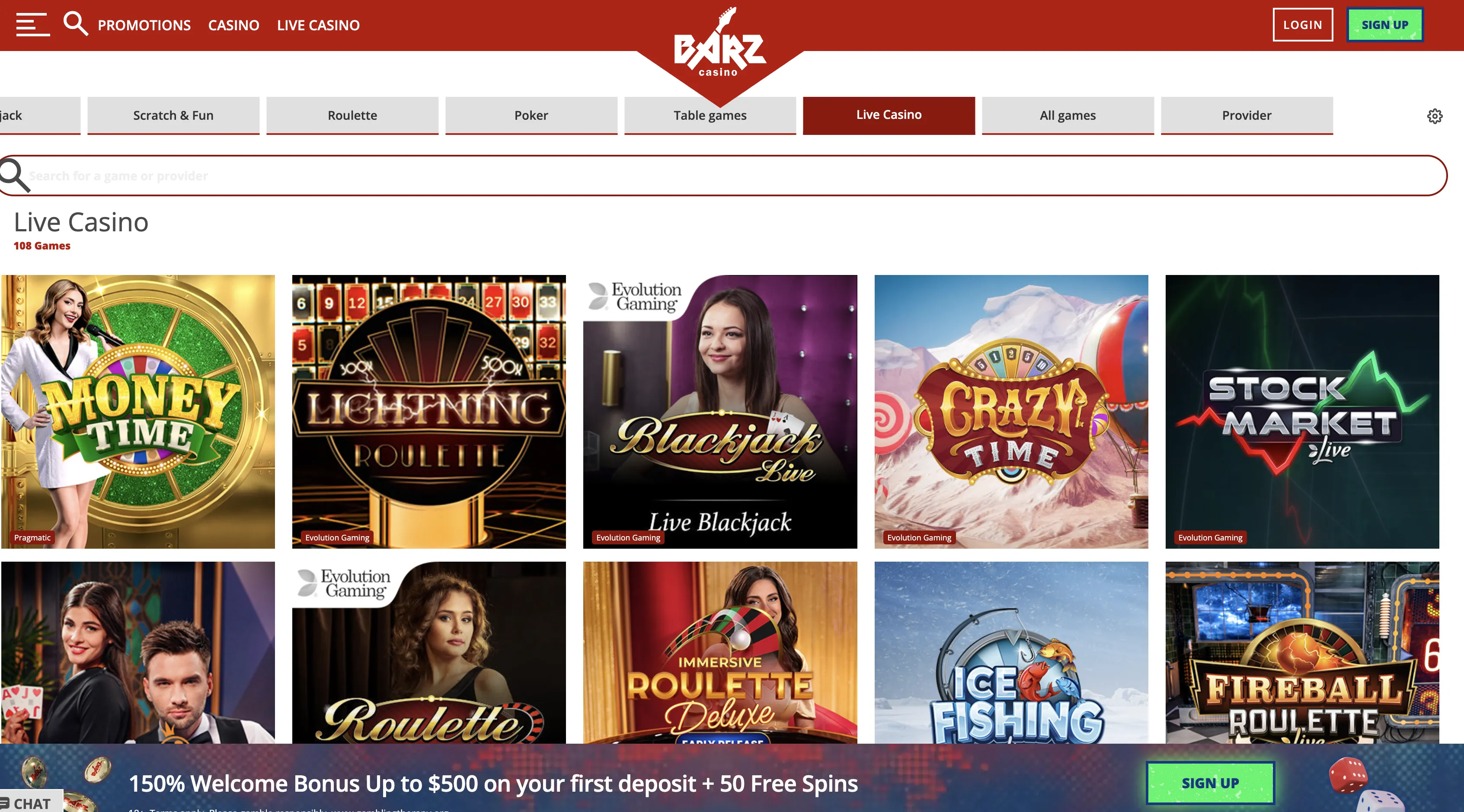 You can access Barz Casino’s live dealer casino from the “Live Casino” tab at the top of the page – and here, you’ll find 108 different live dealer games to enjoy. These are powered by both Pragmatic Play and Evolution (previously Evolution Gaming) – and this means you have a huge amount of choice to choose from!