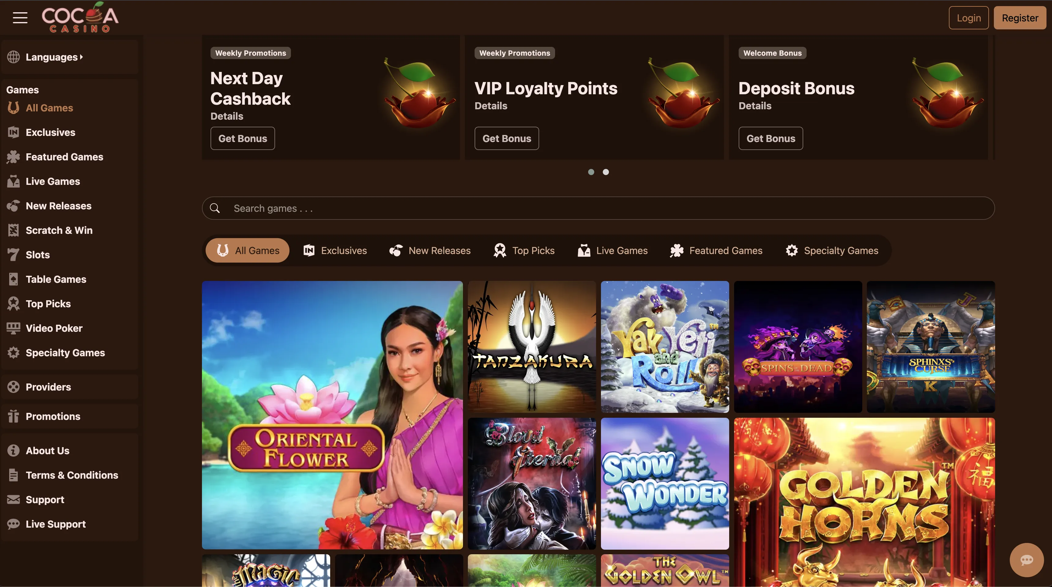 Nothing beats actually playing at a NZ online casino to understand how it actually performs – and I signed up at Cocoa Casino and spent a fair amount of time testing it out for myself. Firstly, signing up for an account was pretty easy. The Cocoa Casino NZ login page is easy to use, and it took me around 2 minutes to register an account. The website’s look is simple and a little old-school with a chocolate-brown color scheme. It’s not as flashy as some newer casinos, but I actually found the simplicity kind of refreshing.