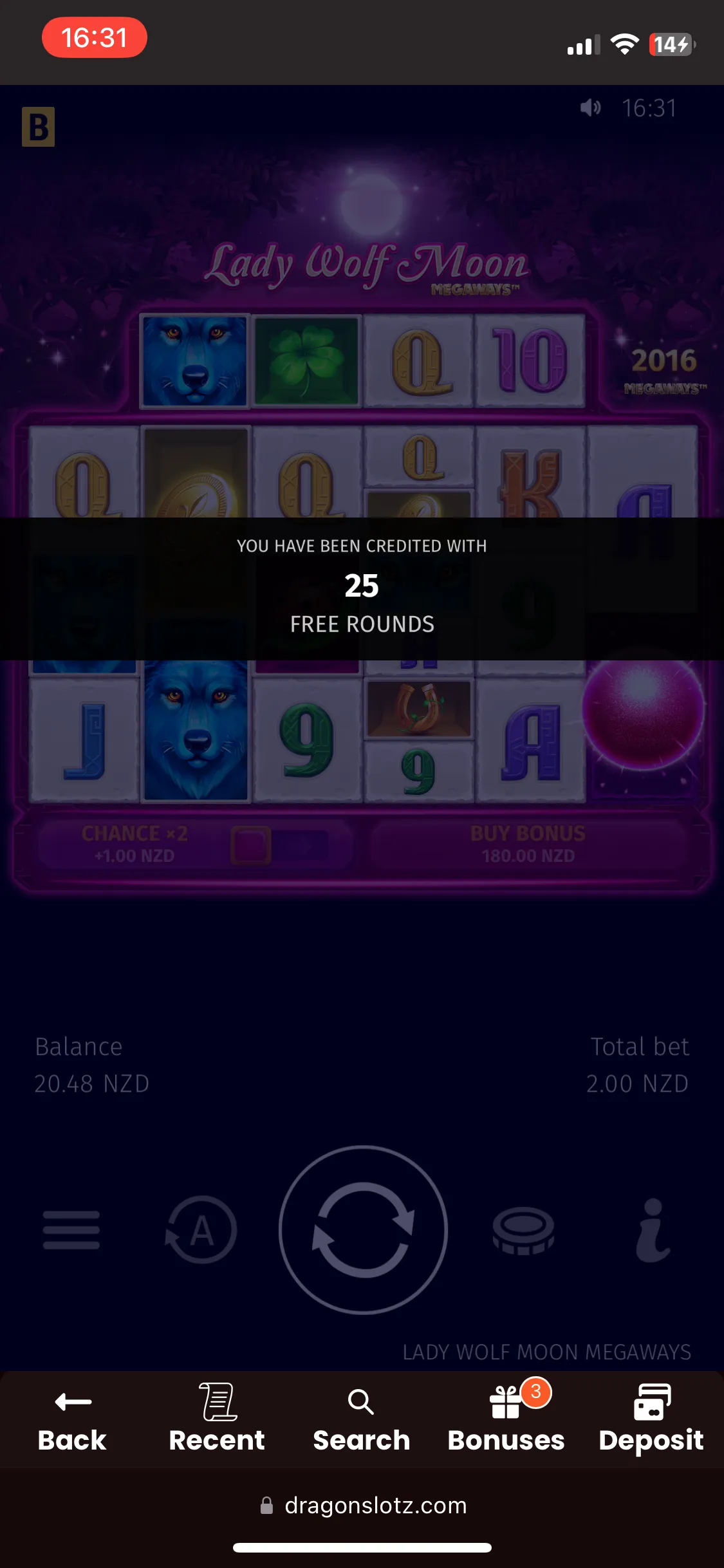 After playing just for a short time, the deposit ran out, so I funded my account again and claimed the second deposit bonus – 25 FS on Lady Wolf Moon Megaways pokie. I then received another 25 FS the next day. I also got 100 % on my deposit, 20 NZD in bonus cash. I first had to meet wagering requirements, and only then could I see my bonus of another 20 NZD, which is divided in 10 parts of 2 NZD each. And in order to get it, I first need to meet wagering requirements, which is quite unusual. I always got 40 NZD immediately and then met wagering requirements for the sum and was able to use the entire sum.