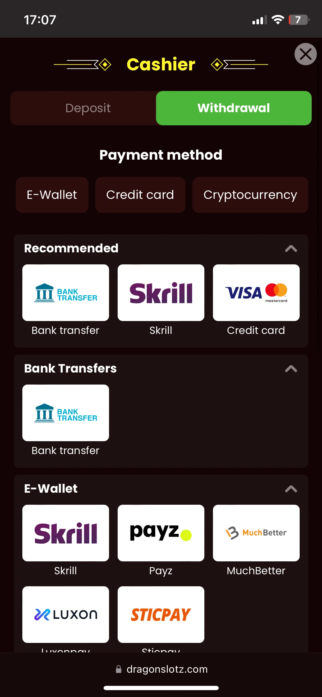 - E-wallets: Skrill, Neteller, MuchBetter, Payz, Luxonpay
