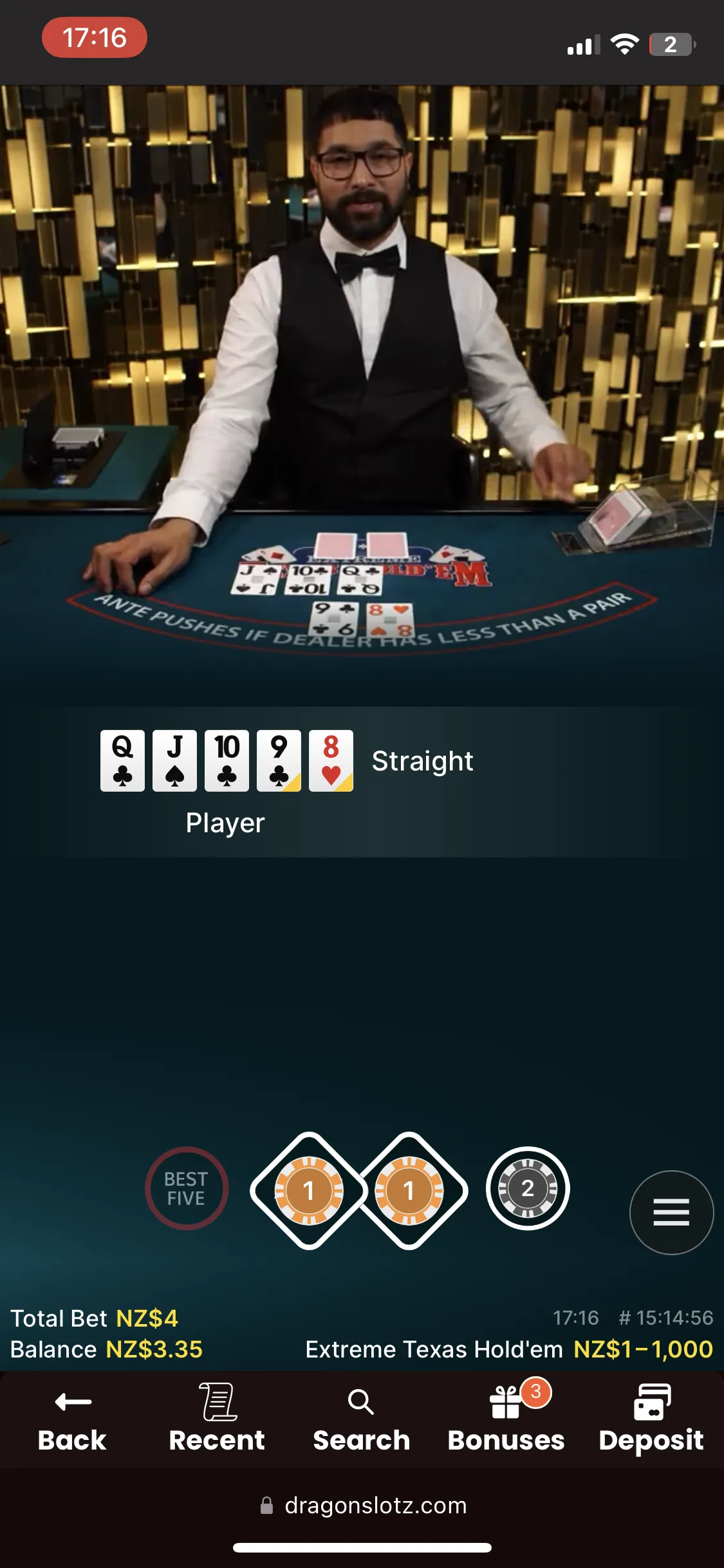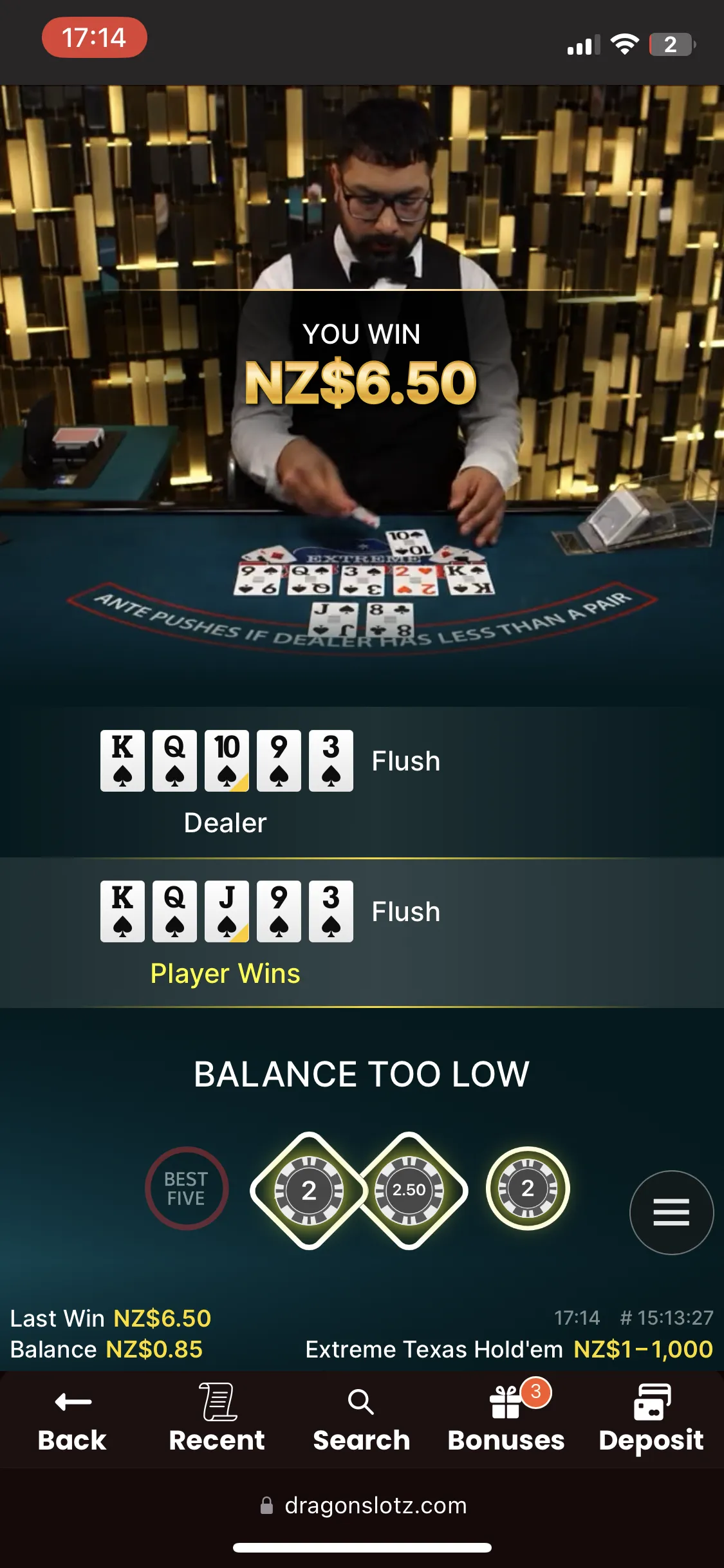 After that, I went to the live casino page and played Extreme Texas Hold’em Poker, where I managed to land a few wins.