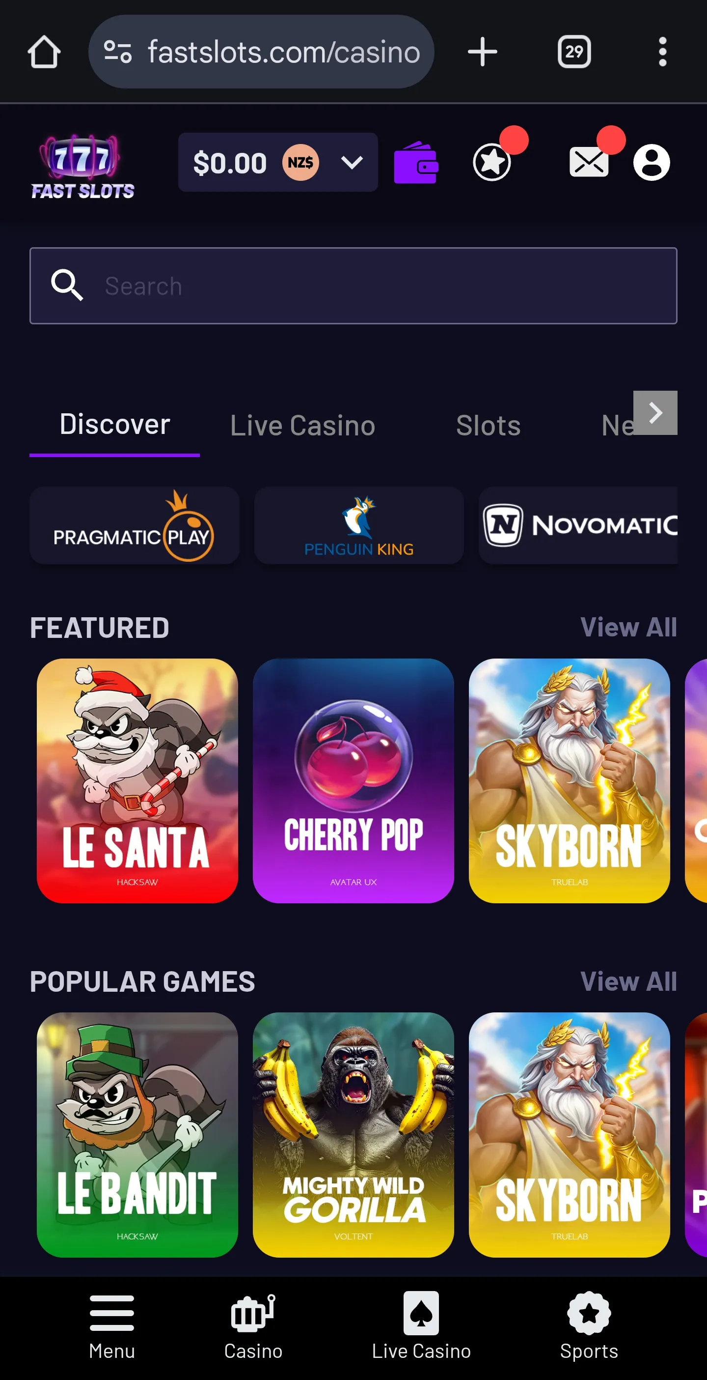 In the “Featured” slots section, for example, I saw Le Santa, Cherry Drop, Skyborn, Chocolate Rocket, while just below, in the “Popular” section, I saw Le Bandit, Mighty Wild Gorilla, and Break the Piggy Bank.