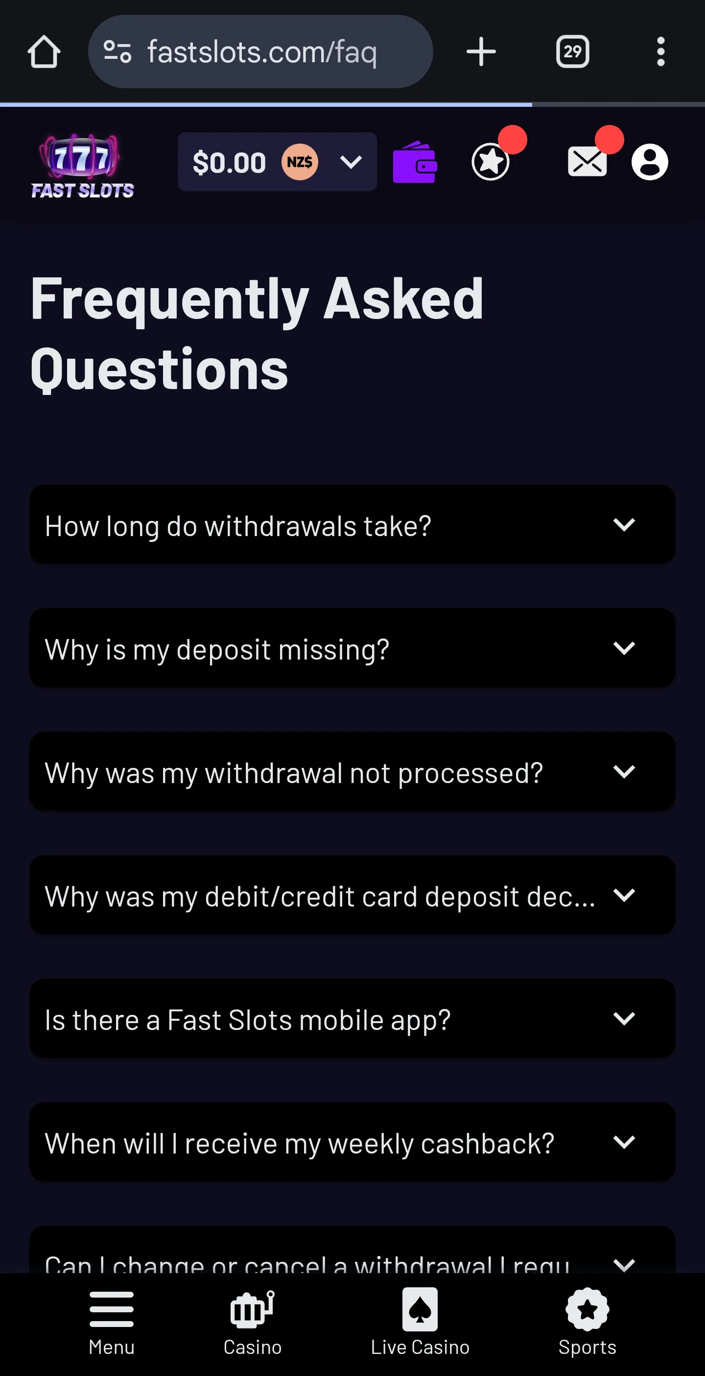 After extensive testing and research, I can confidently conclude that FastSlots Casino is a legitimate and promising option for New Zealand players. It delivers exactly what it advertises, which is a fast, fun, and feature-rich gaming experience, and I really like the large selection of games as it ensures you can find pretty much everything, whether it’s pokies, live dealer games, or sports betting markets.