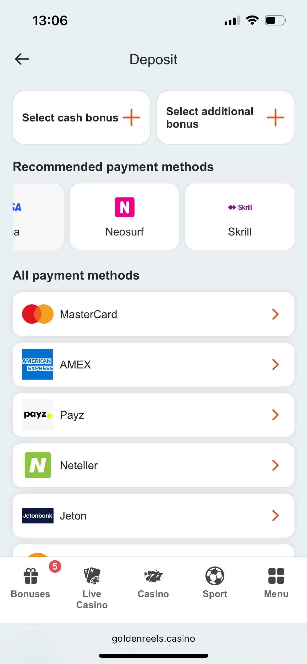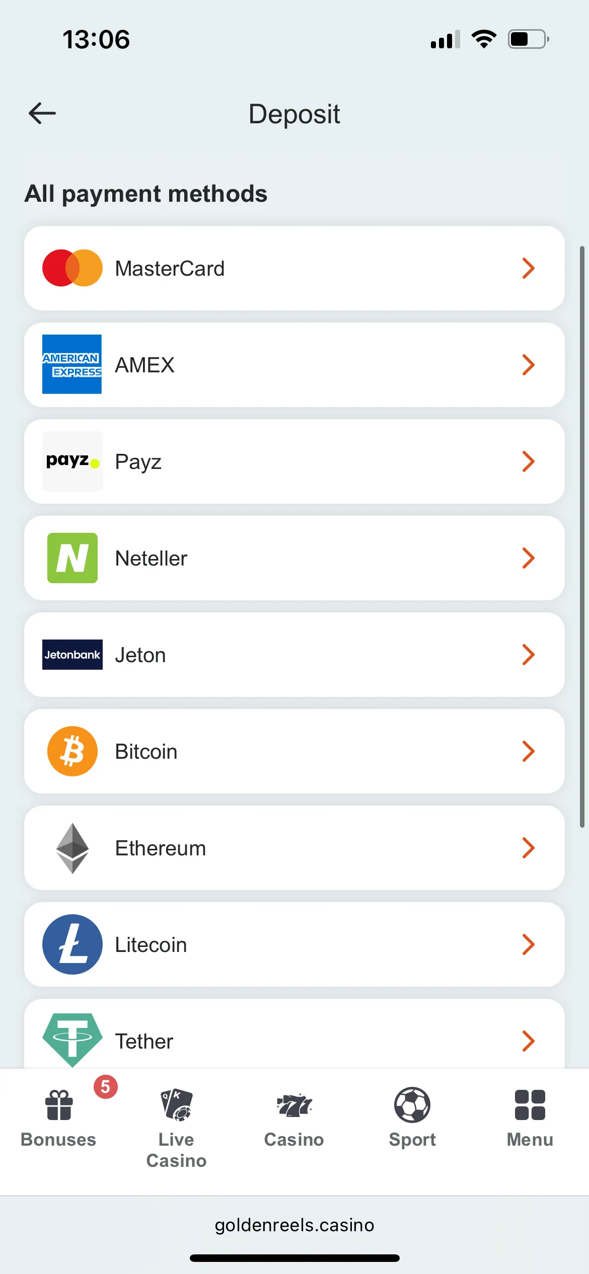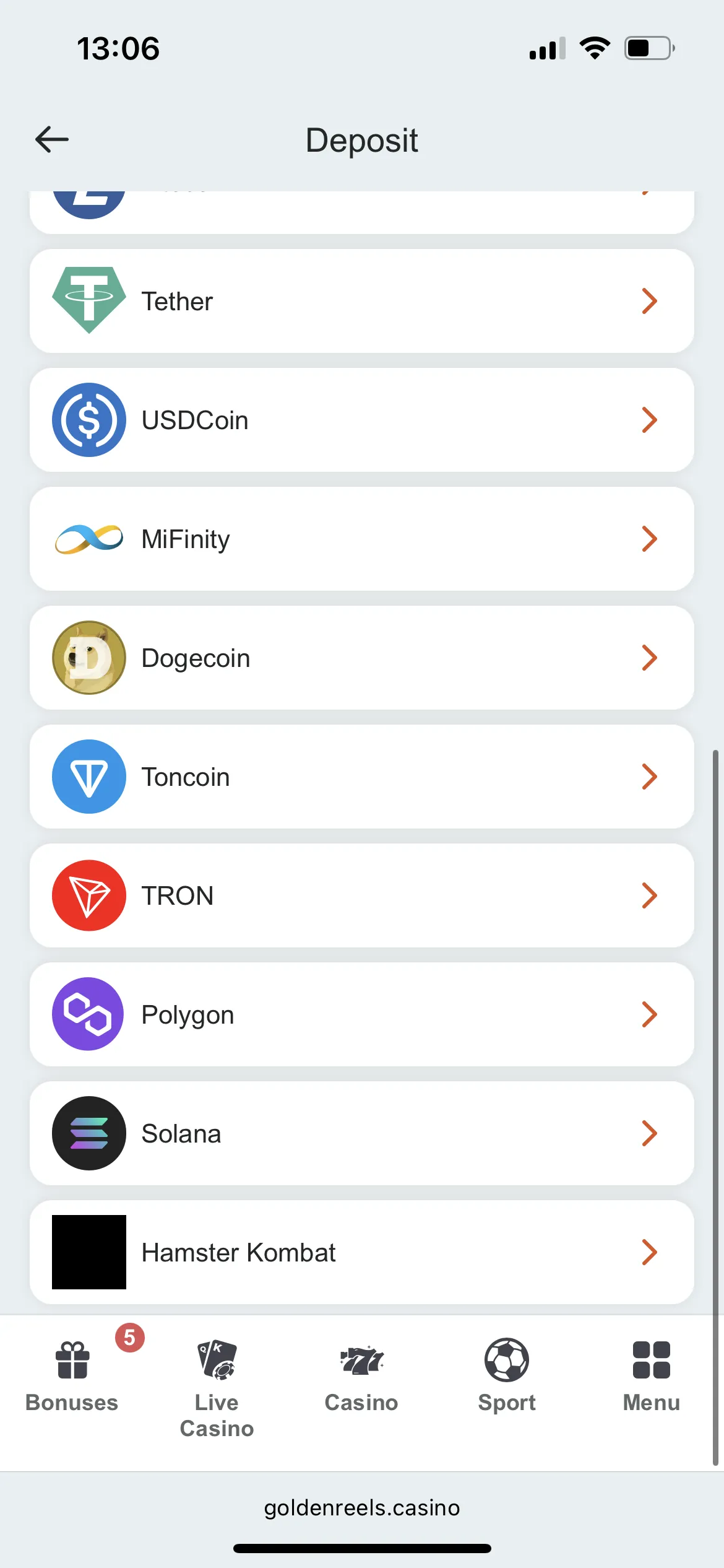 The usual payment methods for a crypto casino apply here. You’ll be able to deposit in Bitcoin, Ethereum, Litecoin, USDT, USDC, Dogecoin and Toncoin, which seems to be a priority for Golden Reels, and everyone else can choose between e-wallets and card payments. The e-wallets available are Skrill, AstroPay, Jeton, Payz and MiFinity. Surprisingly, no Neteller nor Paysafecard.