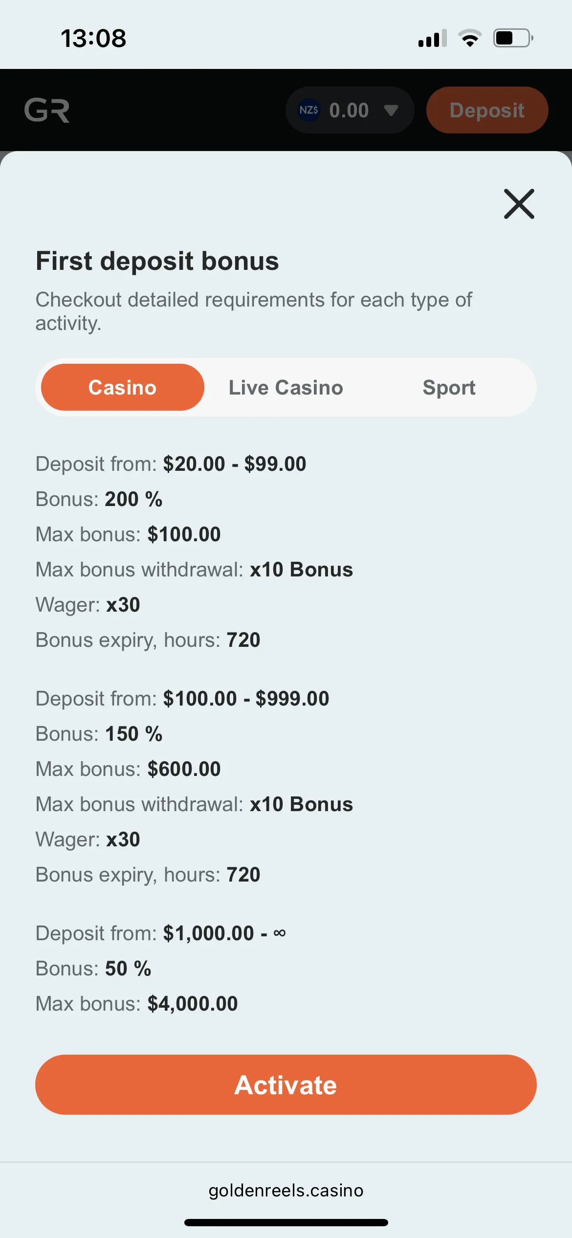 200% up to NZ$2,550 + 50 Free spins