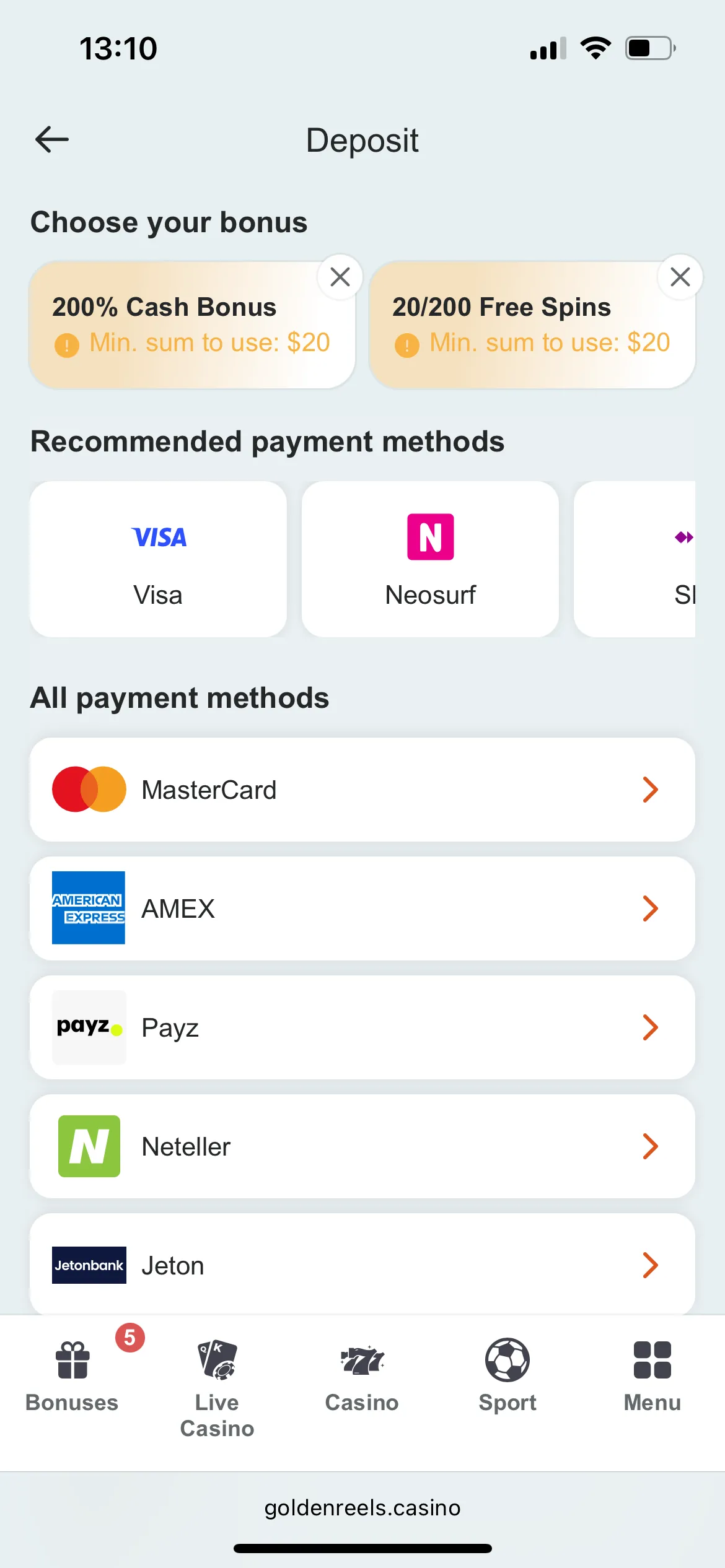 | Deposit options: | Visa, Mastercard, American Express, Apple Pay, Discover Card, Bitcoin, Dogecoin, Payz, Ethereum, JCB, Jeton Bank, Litecoin, MiFINITY, Neosurf, Neteller, PaySafeCard, Ripple, Skrill, USDT |