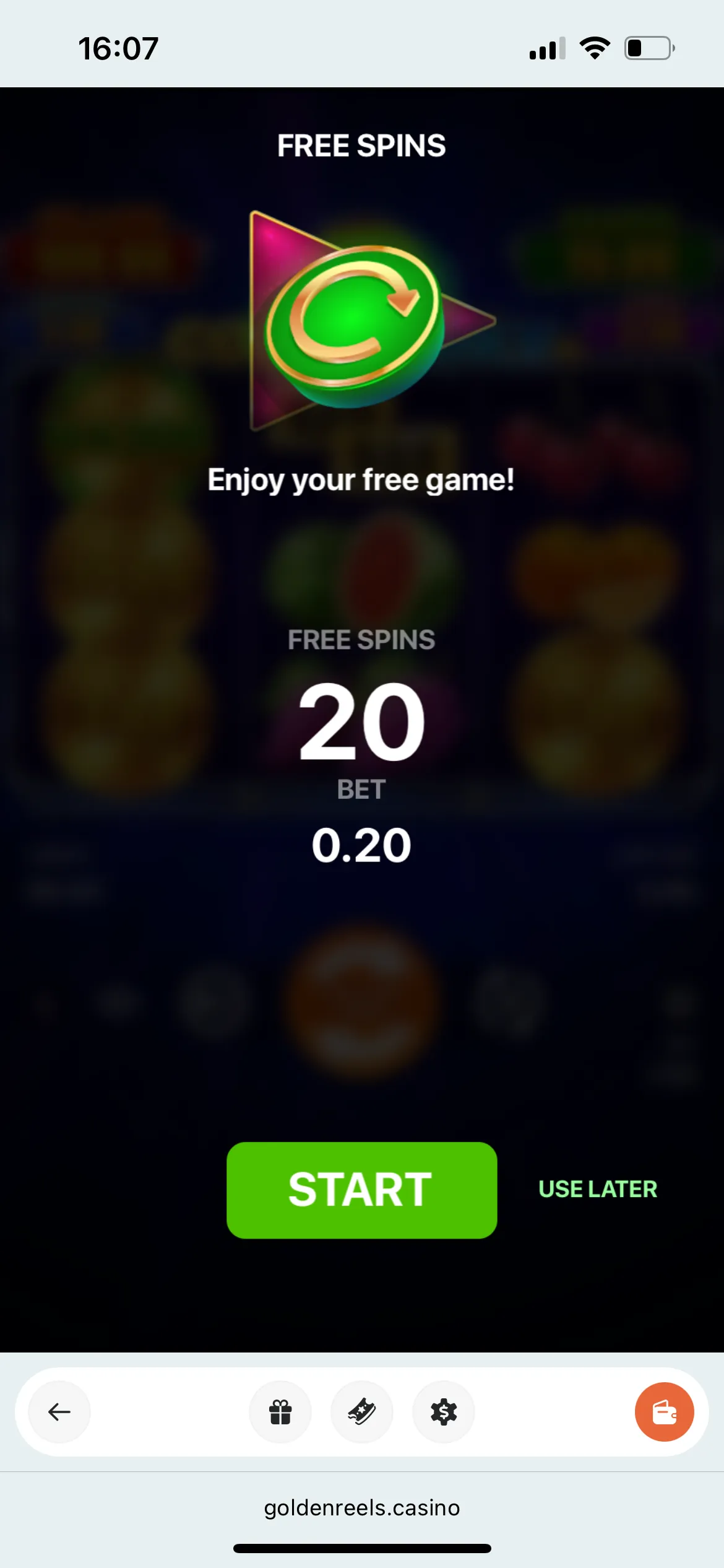I went to the Golden Reels mobile website but got a notice that I’ll get 50 free spins if I install the Android app instead. So I did.