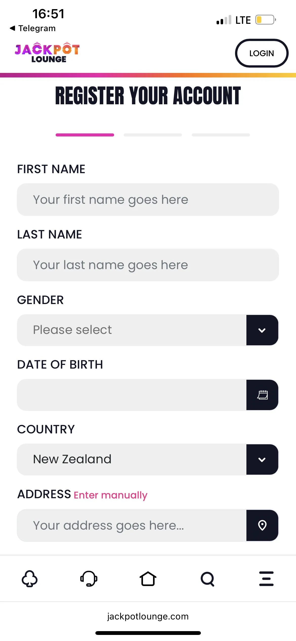 To get started on the Jackpot Lounge platform it does not take long. Proceed to the official casino website and hit the black Sign Up button at the upper right corner. Now you have to provide the following details in the three-step registration: