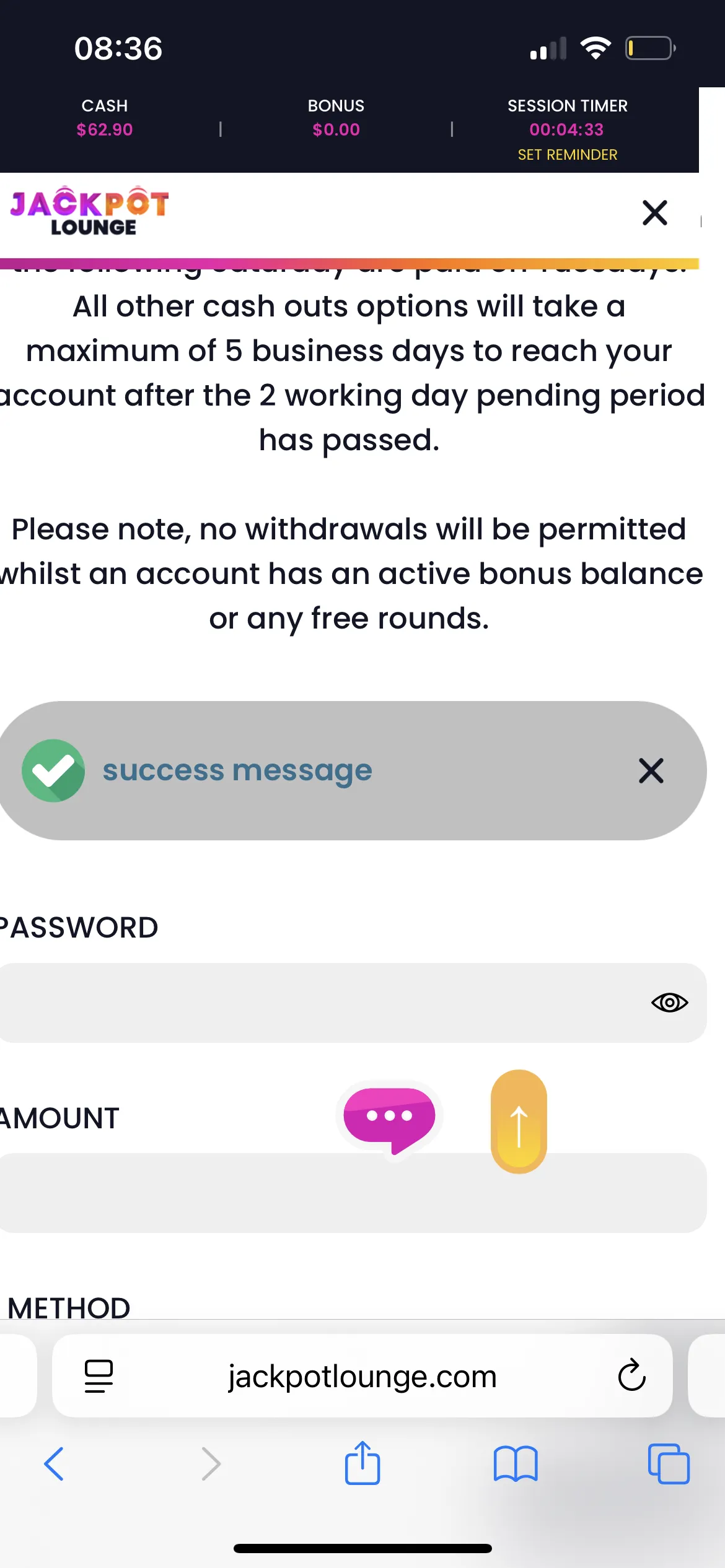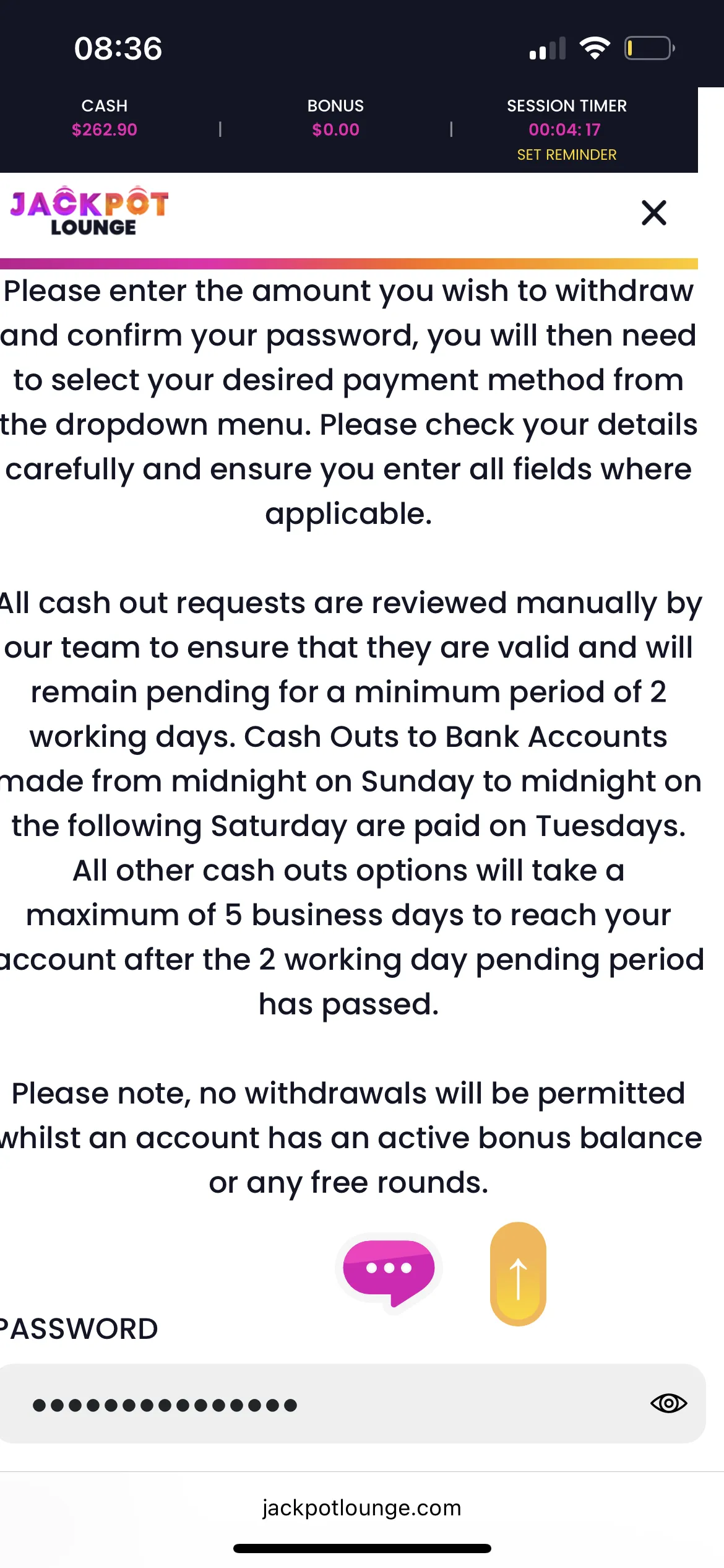 10 Jun, 2025I registered with jackpot lounge also and did a withdrawal of $700nzd on the 30th and I am still waiting. I played the games within the terms of conditions and received an email saying my withdrawal had been rejected but when I went to access my account it was locked. After several emails requesting an explanation on the rejection and the locked account I have only had one reply asking for my details so they could proceed in answering my query. I am still waiting 12 days later. no live chat and people replying to emails. Happy to take my money, but not give it back!
