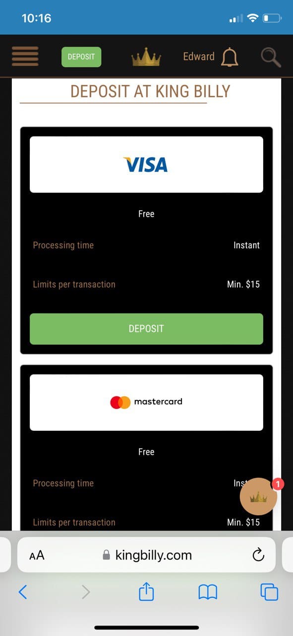 | KYC: | Proof of identity (photo of passport or ID card), proof of address (utility bill or bank statement), proof of deposits (bank statement or e-wallet screenshot/statement showing recent deposits to the King Billy Casino) |