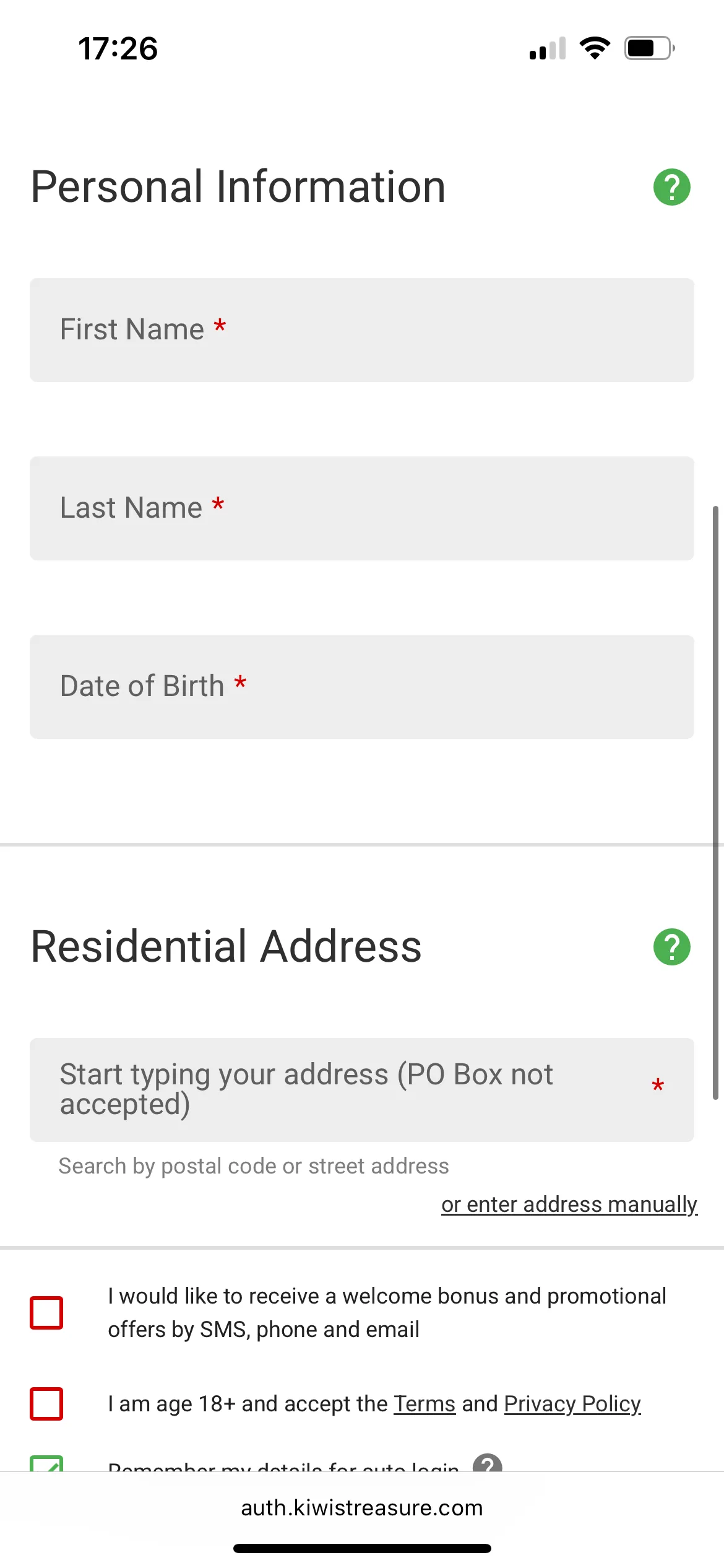 Registration at Kiwi’s Treasure online casino is no different from other gambling sites. I entered my personal and contact information and had to confirm that I am an 18+ individual.