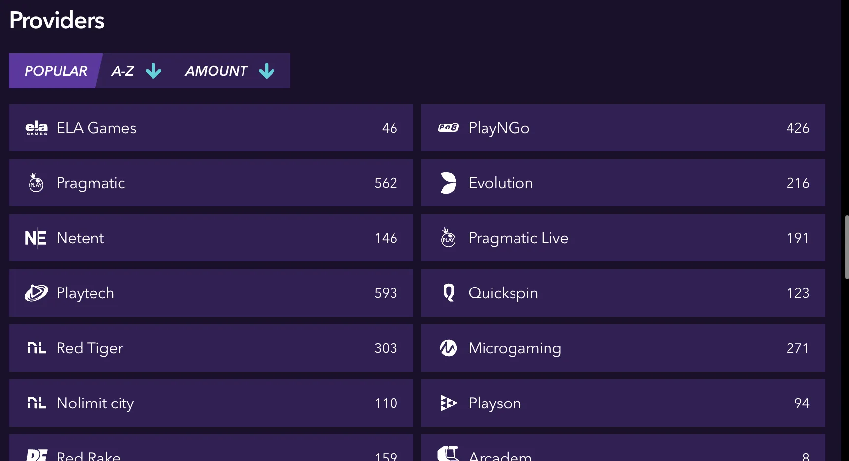 | Providers: | ELA Games, Pragmatic, Netent, Playtech, Red Tiger, Nolimit City, Red Rake, Gaming Corps, Casino Technology, Smartsoft, PlayPearls, Caleta, Ortiz, Candlebets, BetGamesTV, PlayNGo, Evolution, Pragmatic Live, Quickspin, Microgaming, Playson, Arcadem, Swintt, PariPlay, Mascot, Leap, Salsa Technology, Kiron, Ezugi, Givme, Zitro, G.Games, Claw, Stakelogic, Evoplay, Apparat, OnAir, Blueprint, Revolver, Kajot, OneTouch, Big Time Gaming, Rogue, Novomatic, Solidicon, Platipus, Skywind, Apollo Games, FBM, 3 Oaks Gaming, Ruby Play, Bally Wulff, Habanero, NetGaming, Spinmatic, Penguin King, Bombay Live, 7777 Gaming, MEGA, Onlyplay, Hacksaw Gaming, VoltEnt, Amigo Gaming, Spinomenal, Amusnet, Merkur, Yggdrasil, Iconic 21, Gamomat, Fazi, ELK, Endorphina, SlotMill, Booming Games, InOut, Zillion, Betsoft, BF Games, PatePlay, Shady Lady, Relax Gaming, Tequity, Vibra Gaming, Oryx, AvatarUX, GameBeat, Felix Gaming, TurboGames, Kalamba, Reevo, Fugaso, Tada Gaming, Aviator, Mancala, Playnetic, Winfinity, Game Time Tec, 1x2gaming, Iron Dog, Tom Horn, Expanse Studios, Gamzix, Thunderkick, Popiplay, Amatic, EGT Digital, Playhub, Rakerocket |