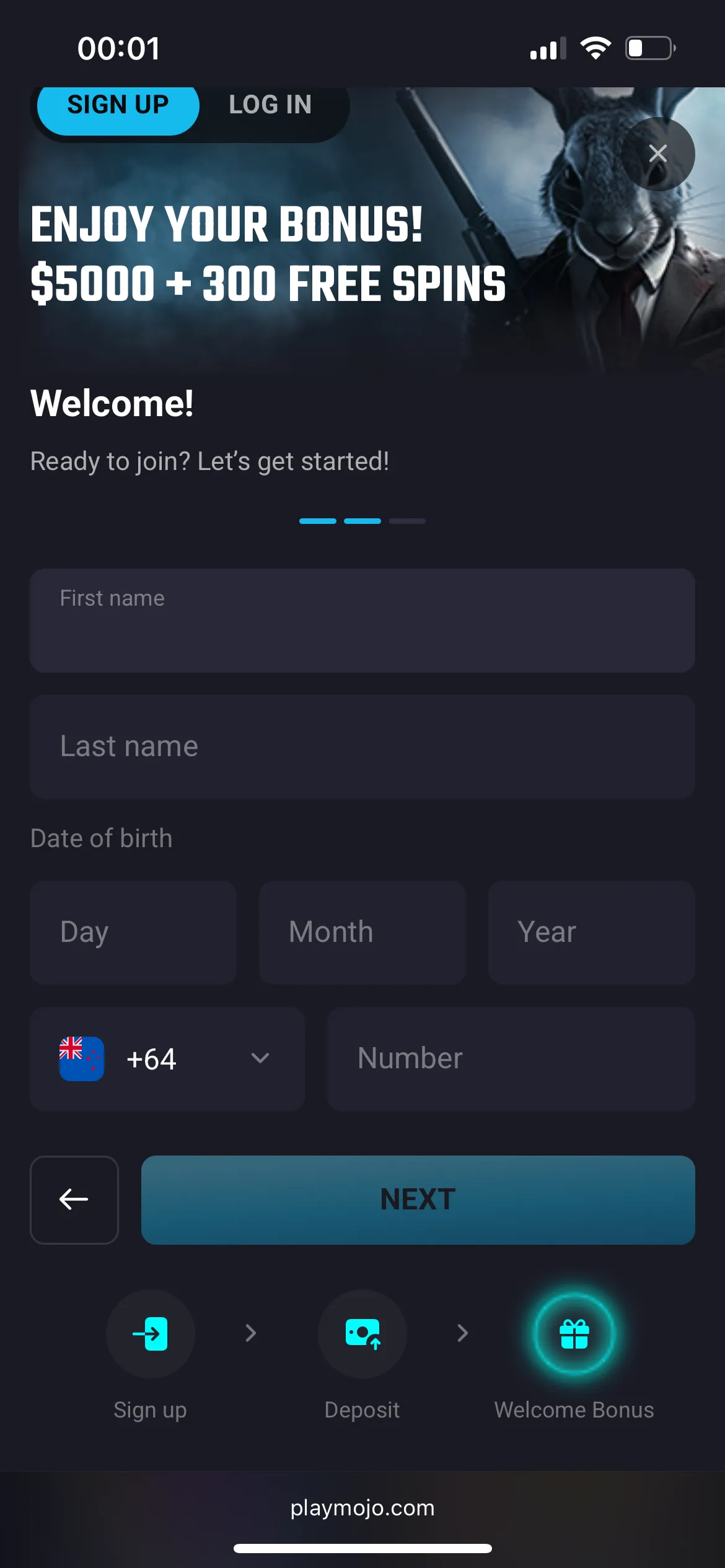 In order to claim a welcome bonus, play pokies for real money and get loyalty rewards, you must create a PlayMojo login. You should easily locate a blue Sign Up button at the upper right-hand corner of the official site. Click it and provide this information: