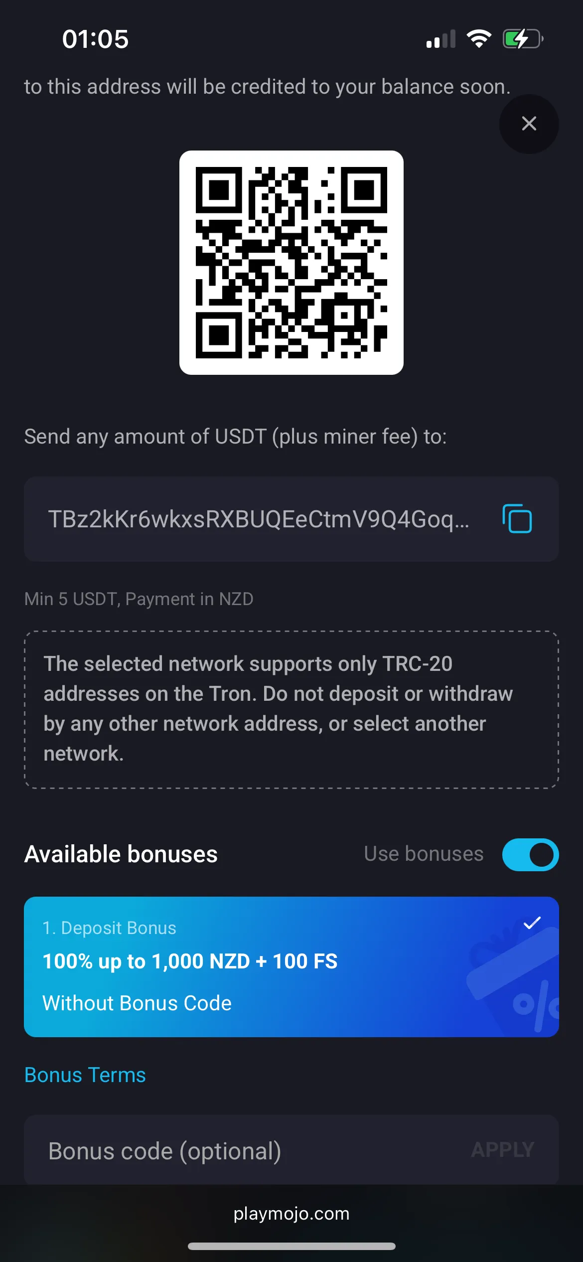 PlayMojo offers multiple deposit methods, including bank cards, vouchers, e-wallets and crypto. I chose the USDT via TRC20. I made a deposit of 14 USDT and was charged 1 USDT as a network fee.