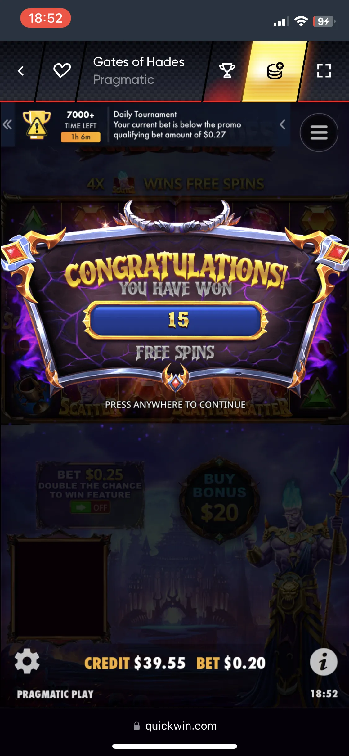 When I activated the welcome bonus, it turned out that I could activate the FS only after meeting the wagering requirements for the cash bonus. I didn’t like that all the funds (both your own and bonus) are mixed in the bonus account. In fact, I was obliged to playthrough the wager. Otherwise, I couldn’t withdraw any of the money I won thanks to the bonus. At most gambling sites I played previously, the money is in separate accounts and if you simply haven’t met the wagering requirements of the promotions, you can still cashout your own money you funded your account with. On top of the bonus money, QuickWin gave me 1 bonus crab, but it didn’t bring me anything in terms of extra cash.