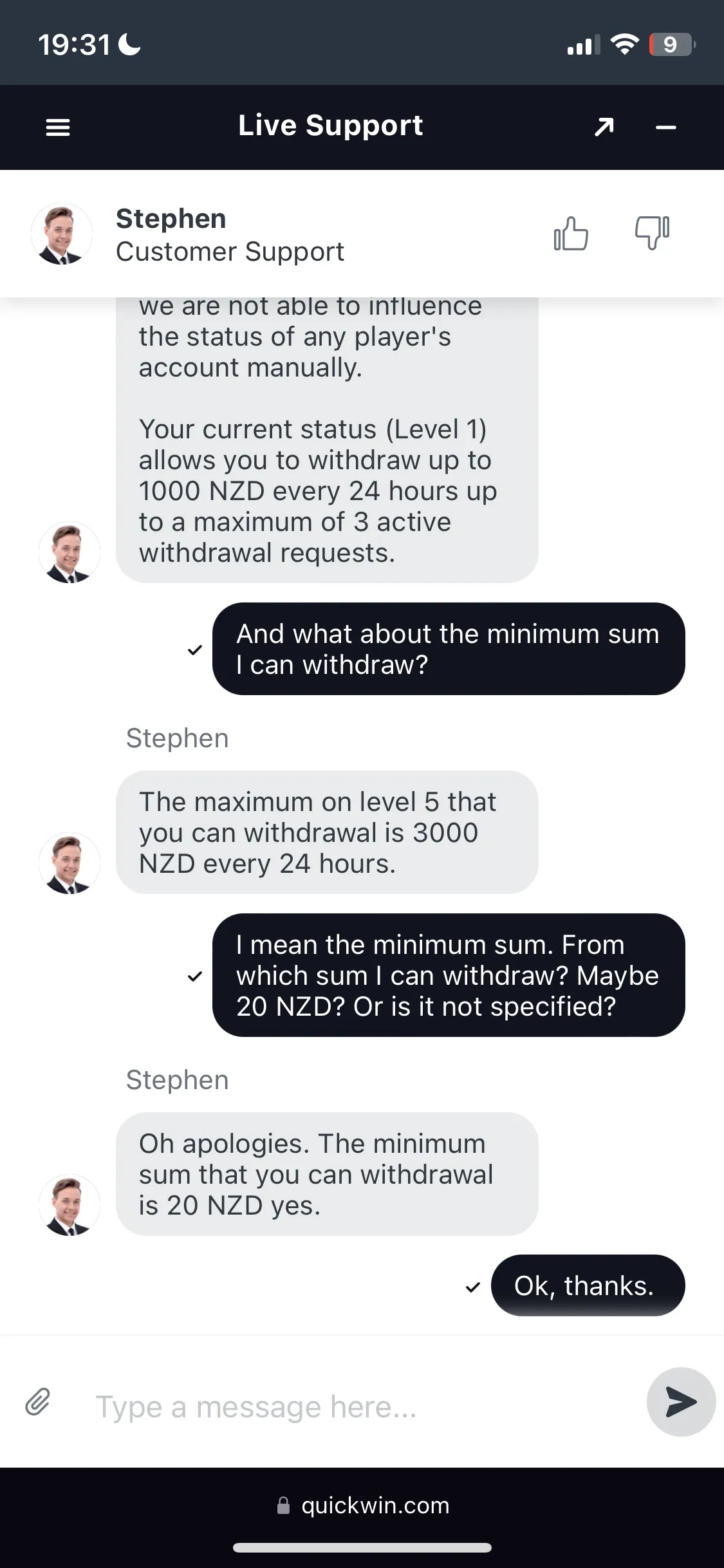 Of course, QuickWin uses solid SSL encryption technology to protect clients’ personal and financial data. The thing I was impressed with was the choice of safe payment methods, including crypto, which is highly safe and anonymous. If safety is your top filter, see our safest online casinos for other NZ sites that meet strict checks.