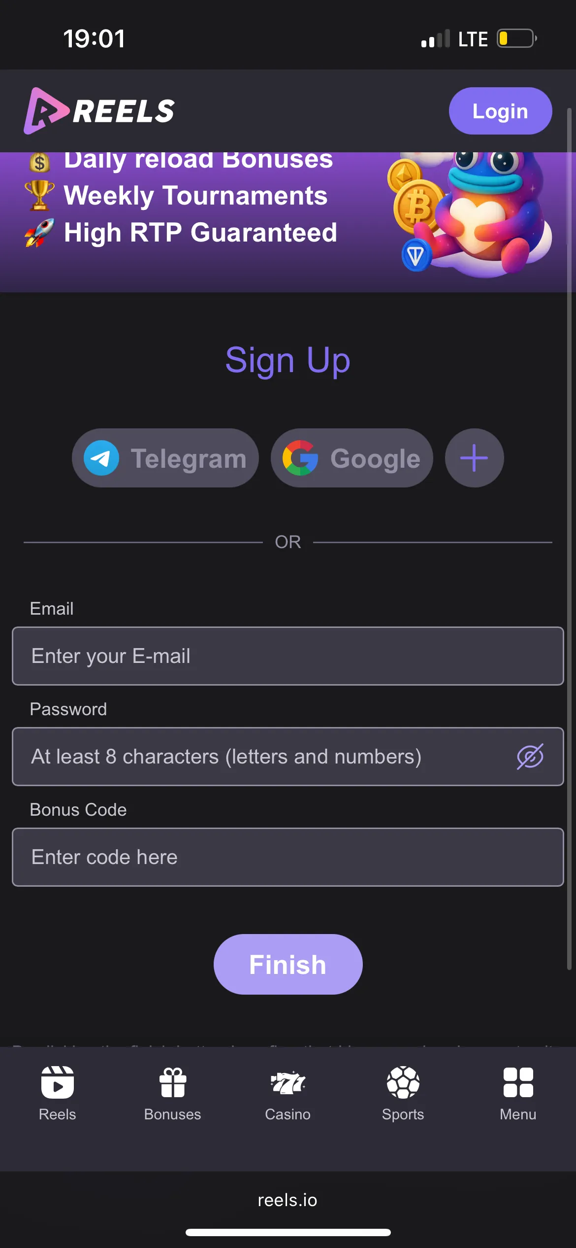 Reels NZ login was quick and easy. All I needed to fill in was my email address and email. It really can’t be easier. I also had an opportunity to create an account via Telegram, so Kiwi players will have two options.
