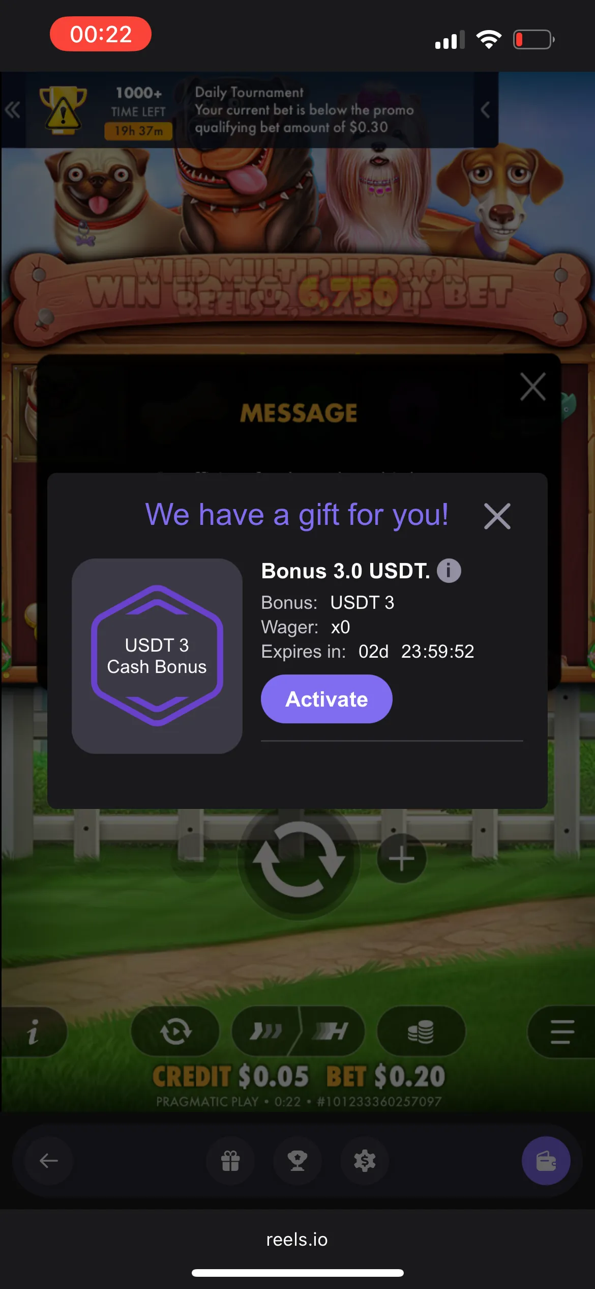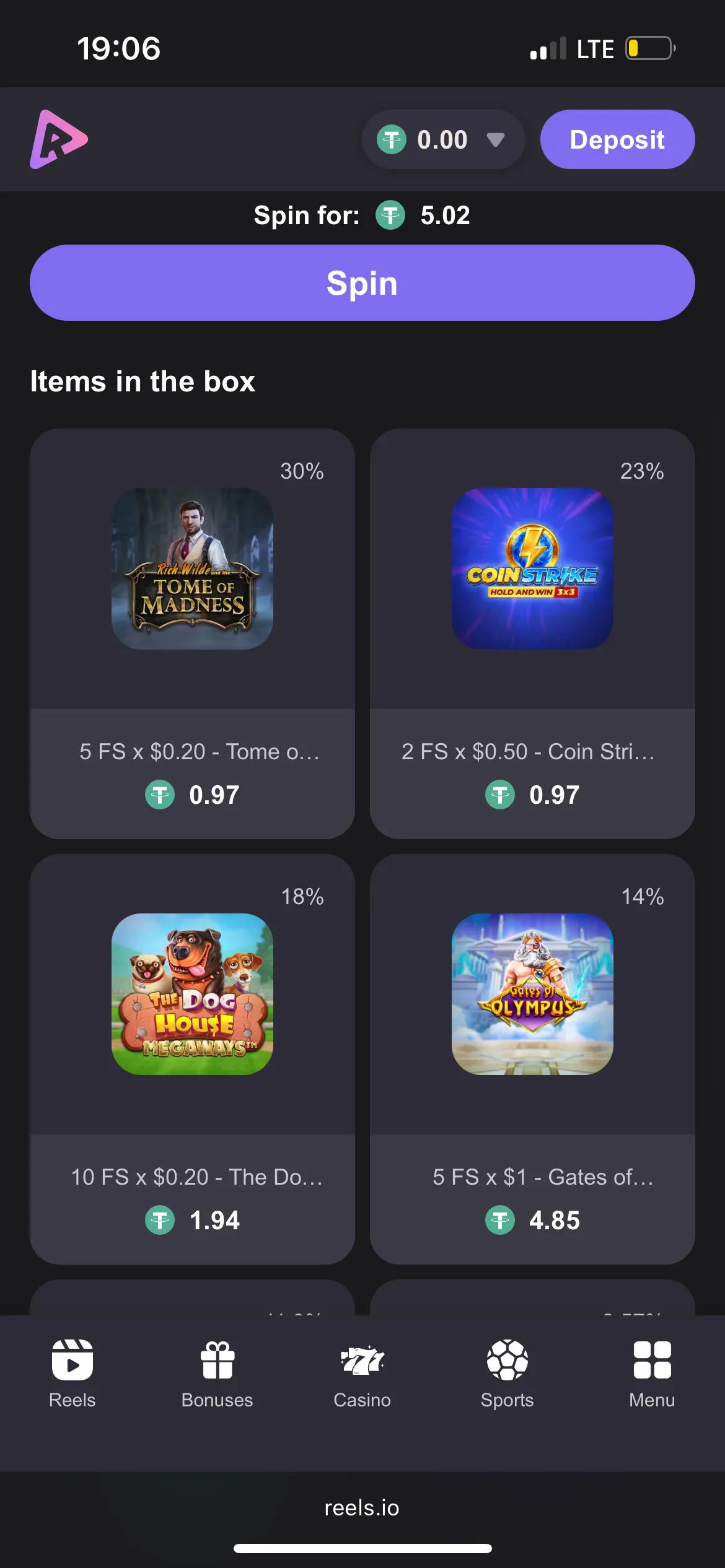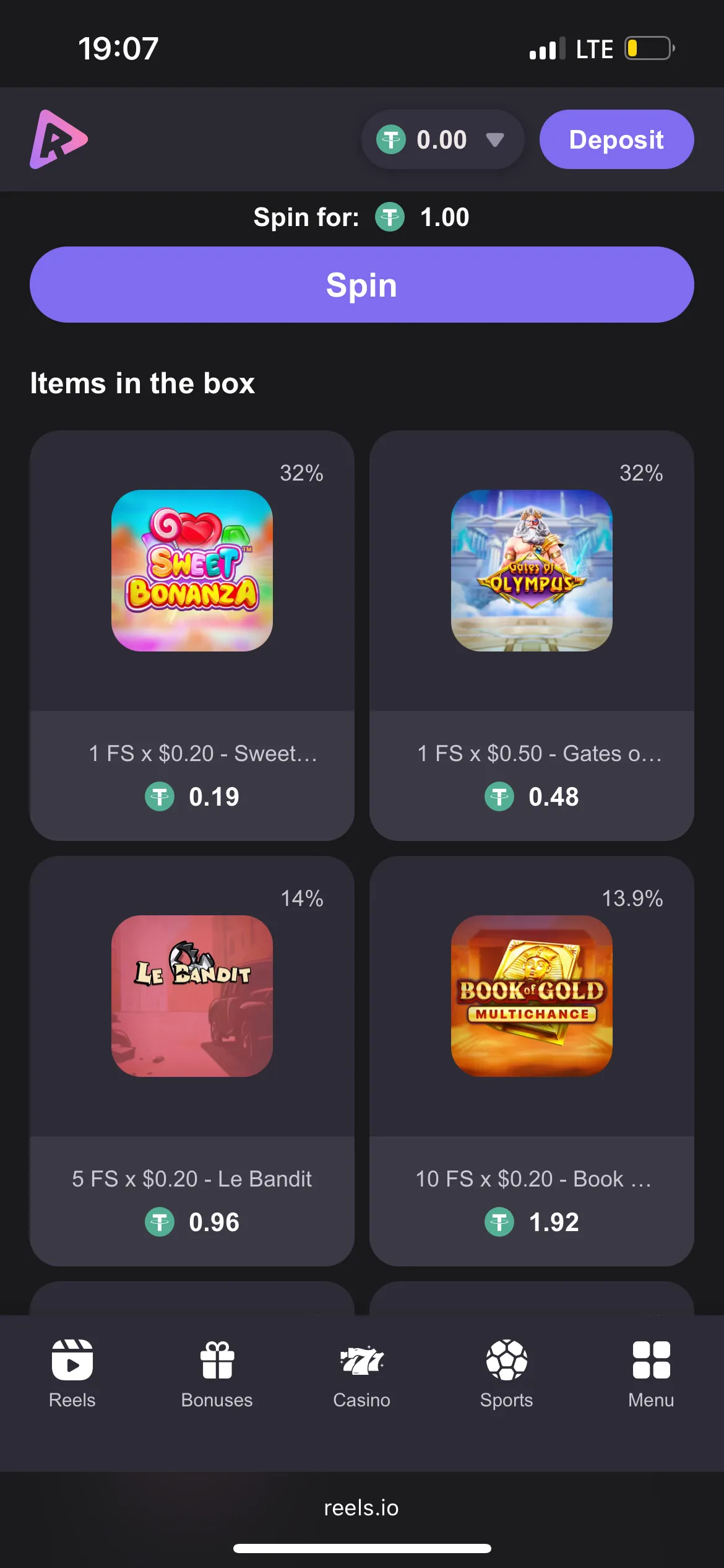 However, Reels offers Lootboxes. I bought the cheapest one for 1 USDT and received 1 free spin on Sweet Bonanza for 0.20. I then received Reels no deposit bonus and no-wager bonus of 3 USDT. Quite nice.