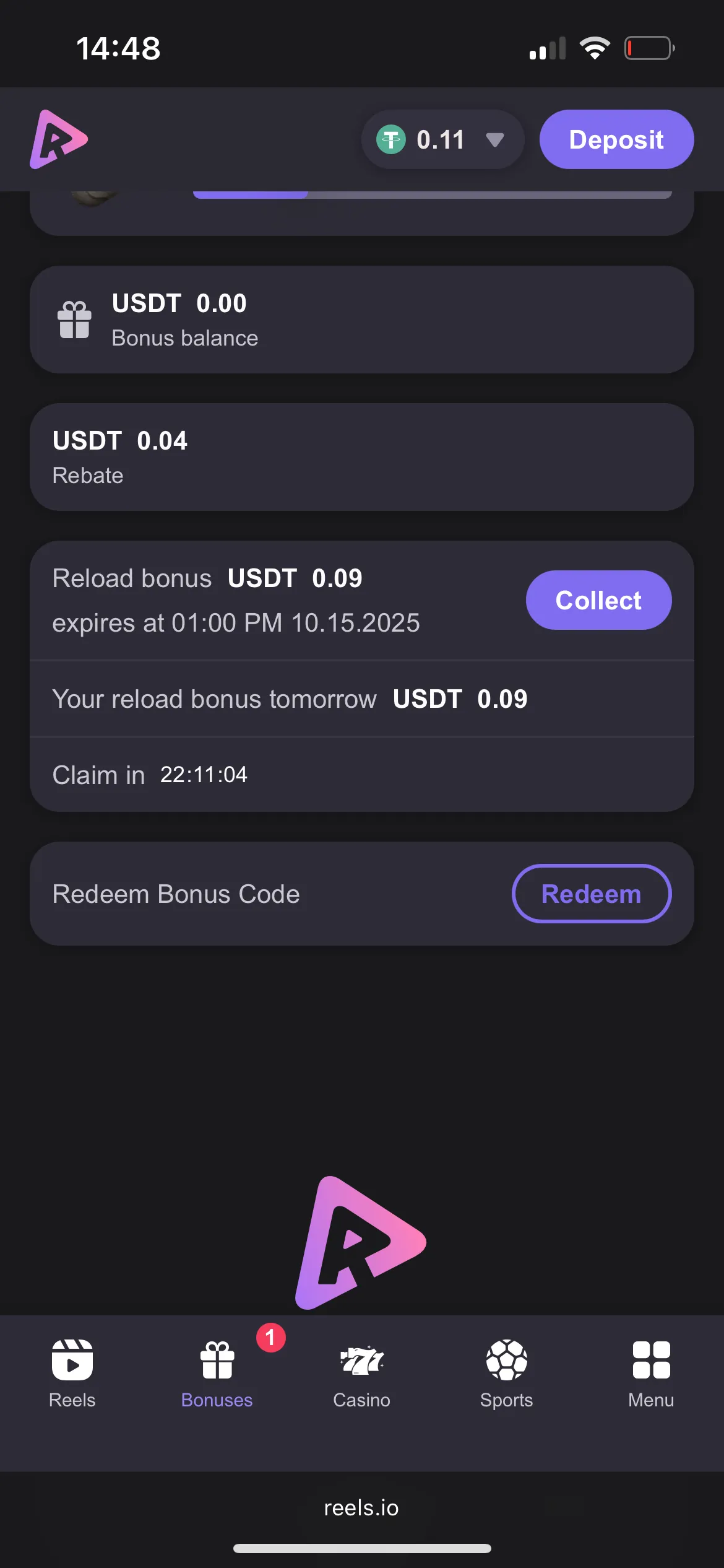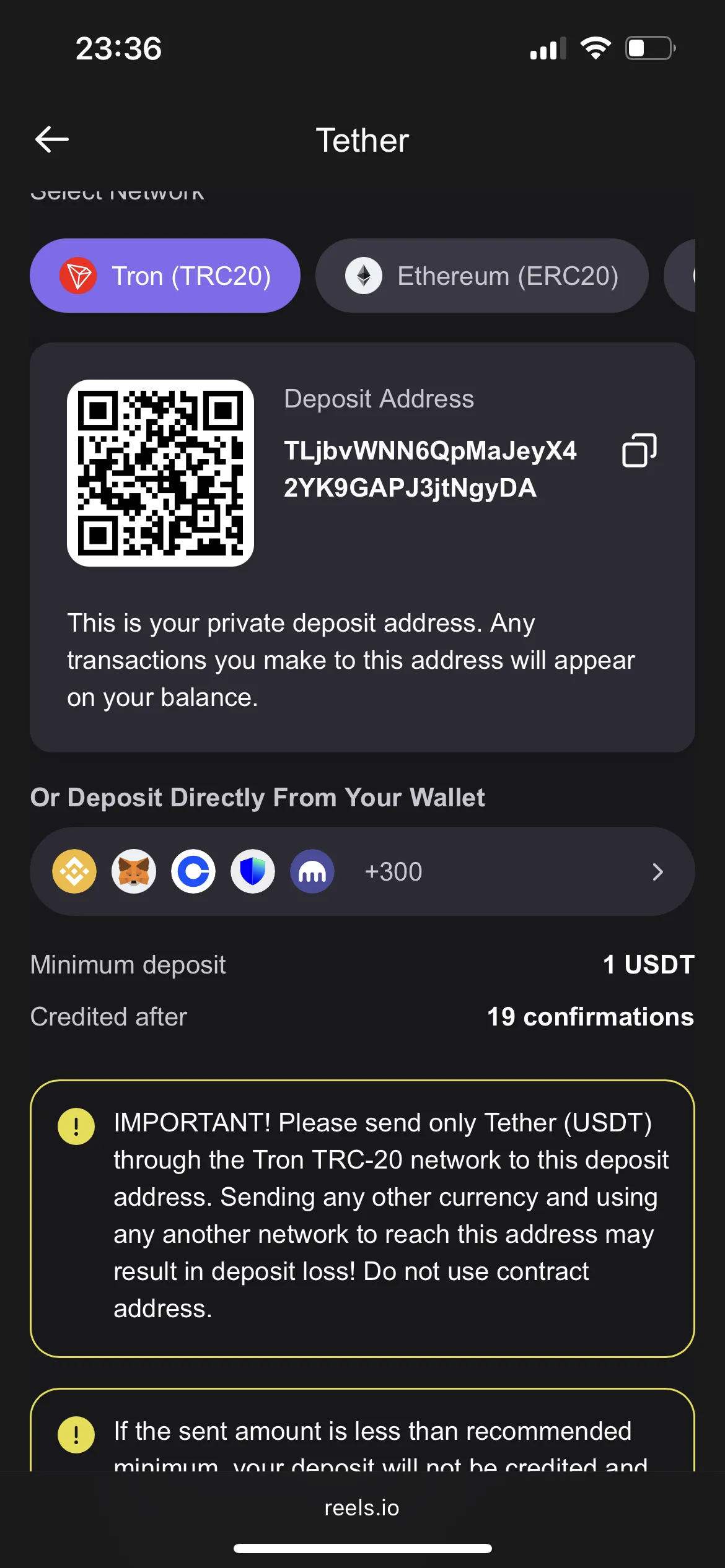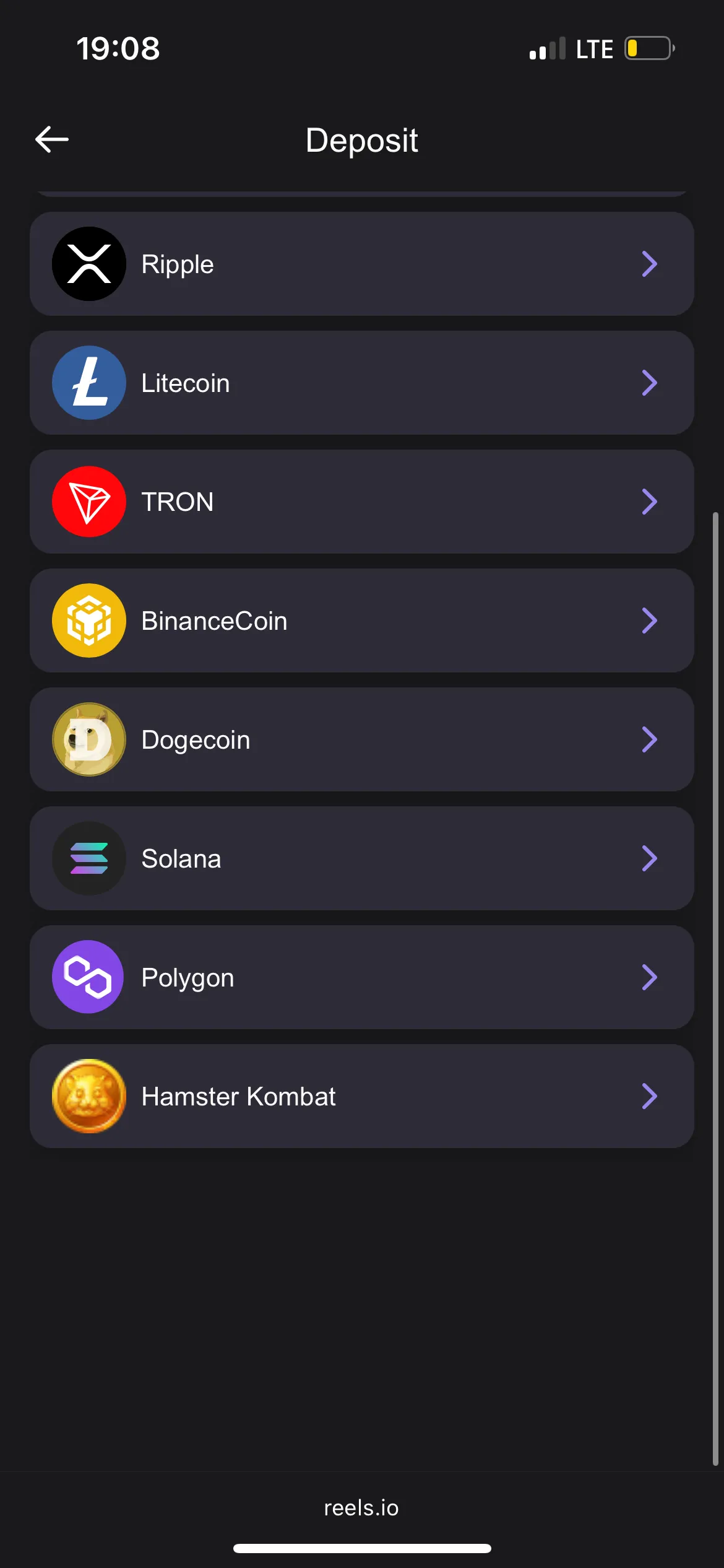 Since Reels is a crypto casino and doesn’t accept fiat currencies, it does offer a great choice of digital currencies to fund your account. For my first deposit, I chose the USDT network TRC20. The money arrived instantly, but I found there was no welcome bonus.