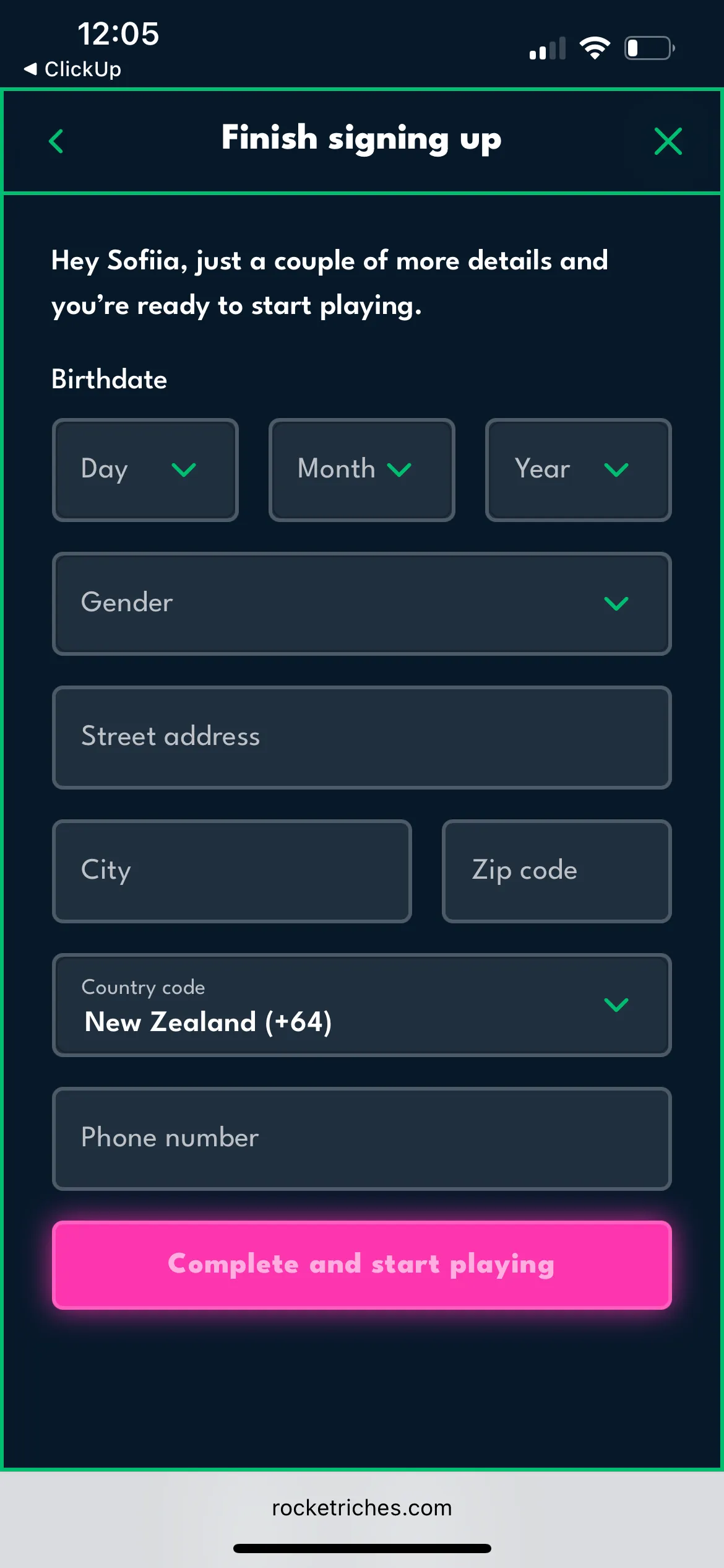 To create an account at Rocket Riches, proceed to the casino’s official website and click the Sign Up button in the upper right corner. Then provide the following information:
