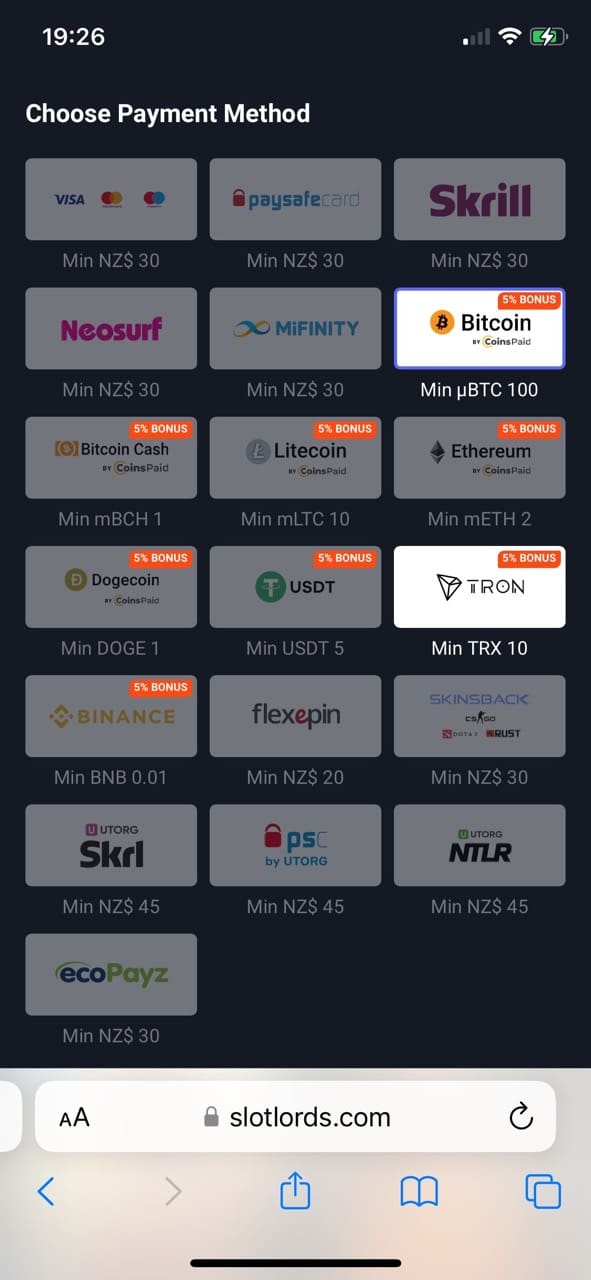 As always, I started from registration to see how easy and fast it is. Well, SlotLords asks pretty much the same information as other NZ gambling sites. I entered my name, date of birth, address, phone number, email address, and password. Once registration was completed, the casino site suggested making the first deposit. I picked Skrill among the offered payment methods and funded an account with 30 NZD (it was the minimum deposit amount for Skrill). With the money in my account, I claimed the first bonus from the welcome pack, which was 100% + 100 free spins on the Book of The Fallen pokie. The RTP of the pokie on Programmatic Play is 96.50%, while at SlotLords is 94.47%. It’s not a massive issue, yet it’s not accurate.
