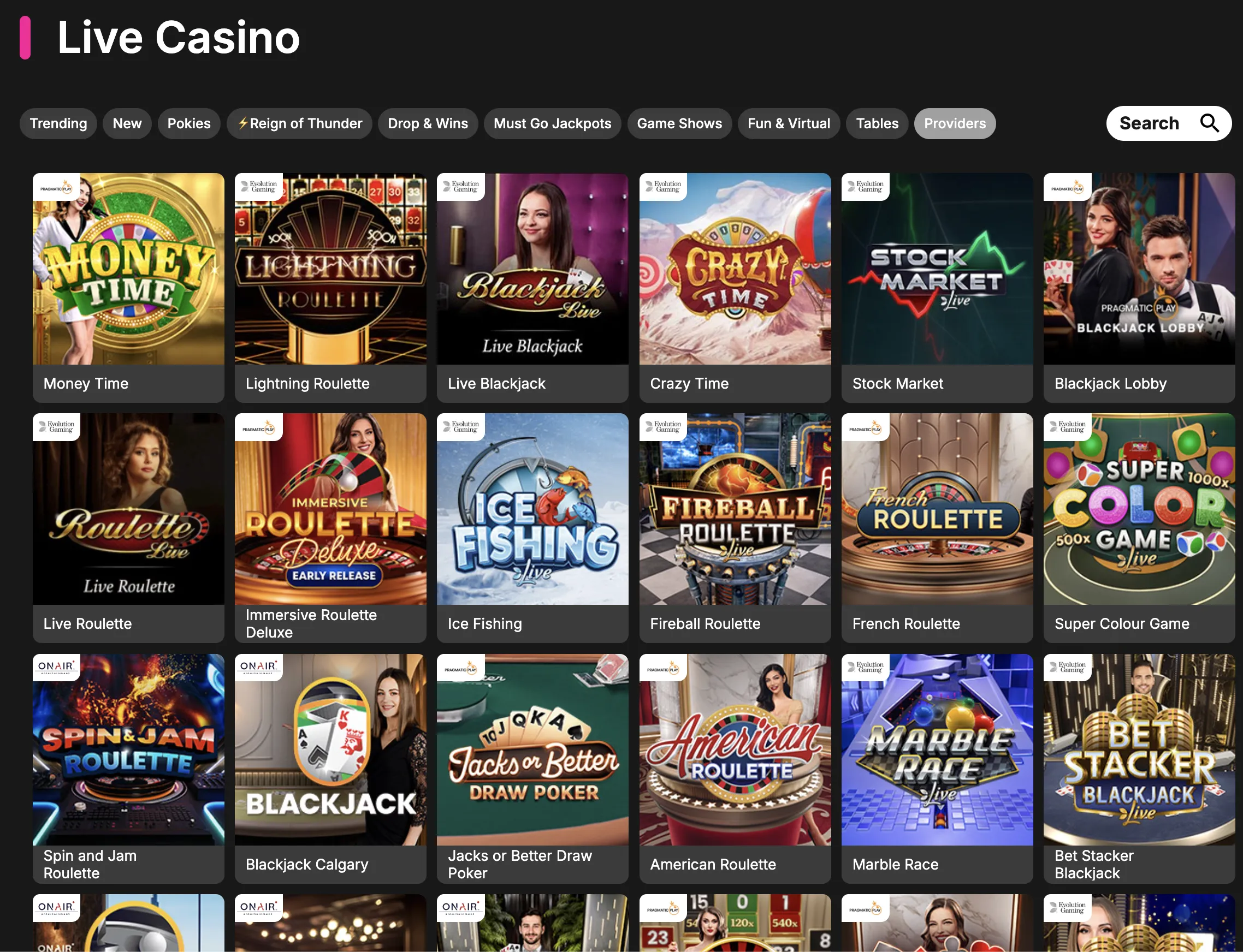 Evolution (previously Evolution Gaming) powers the live casino with tons of blackjack, roulette, and game show titles. I was happy to see everything from Infinite Blackjack to Lightning Roulette – along with, of course, Crazy Time, Monopoly LIVE, and Funky Time.