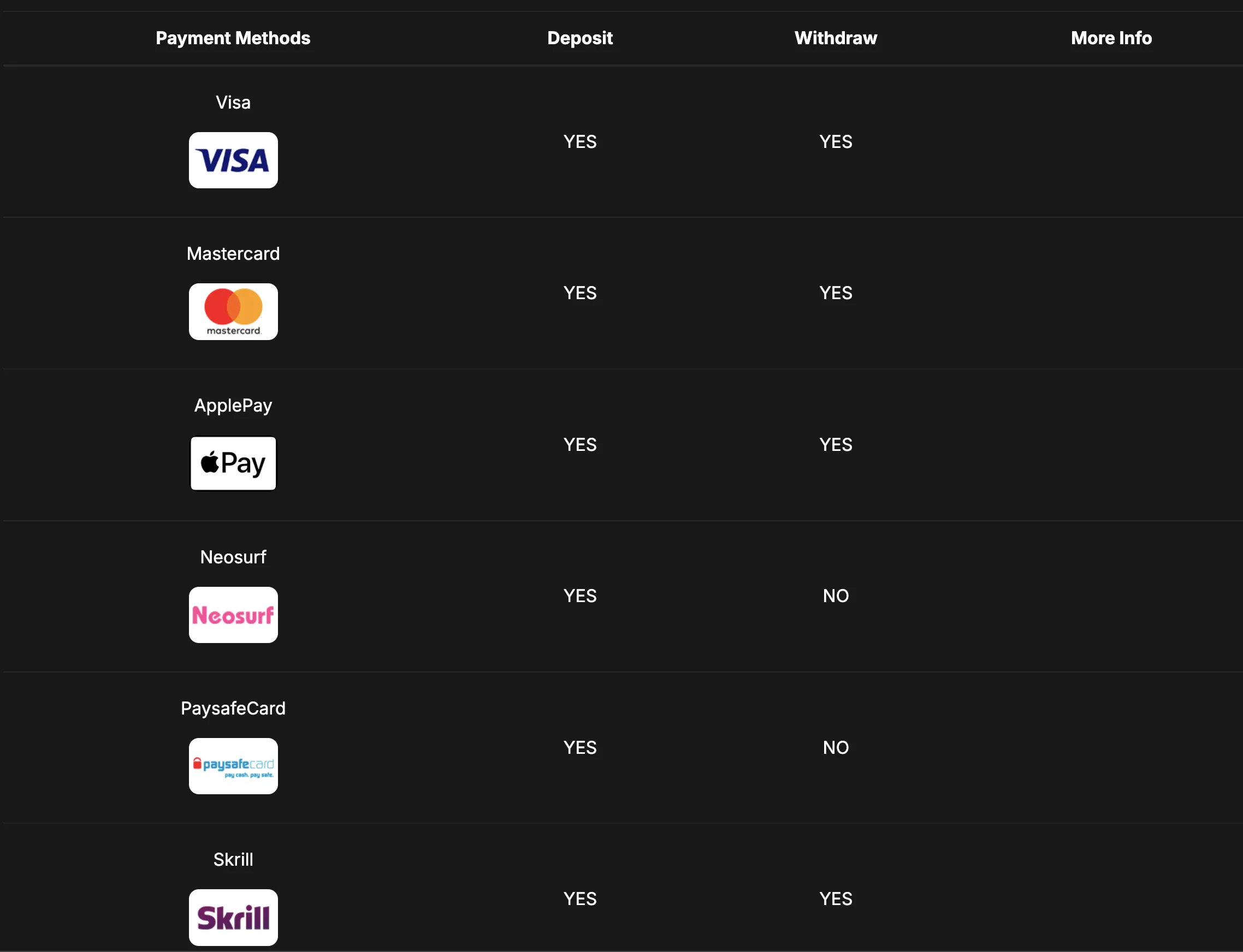 | Deposit and withdrawal | A solid selection of payment methods including Credit and Debit Cards, Apple Pay, Neosurf, Skrill, Neteller, PaySafeCard, Bank Transfer, and others; no crypto. |