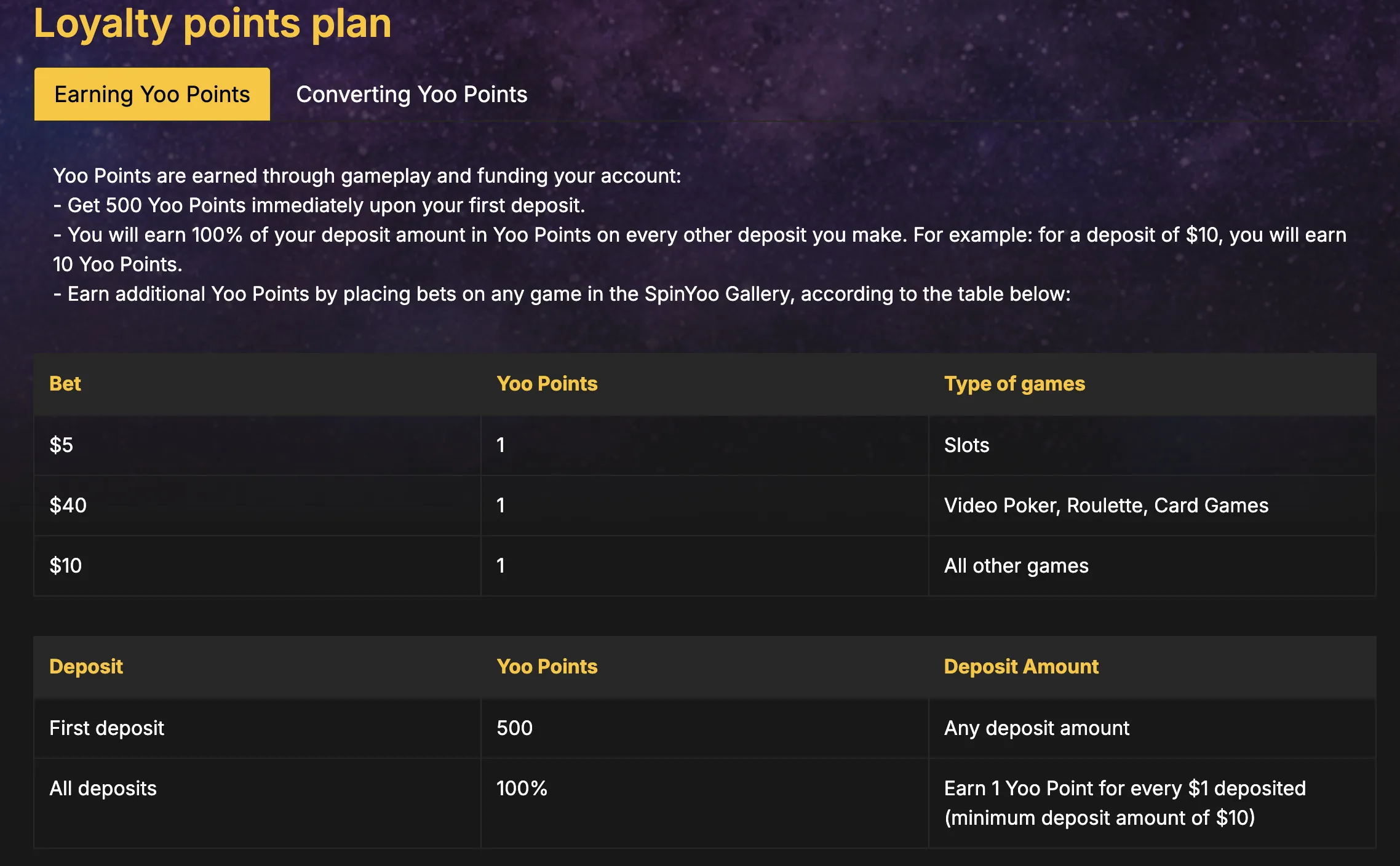 SpinYoo’s Yoo Club has a kind of combined points-for-play system with tiered rewards. You earn Yoo Points on every real-money bet (faster on slots), plus a point per NZ$1 deposited. Points can be exchanged for bonus cash (with standard wagering applying – so a little on the high side.(