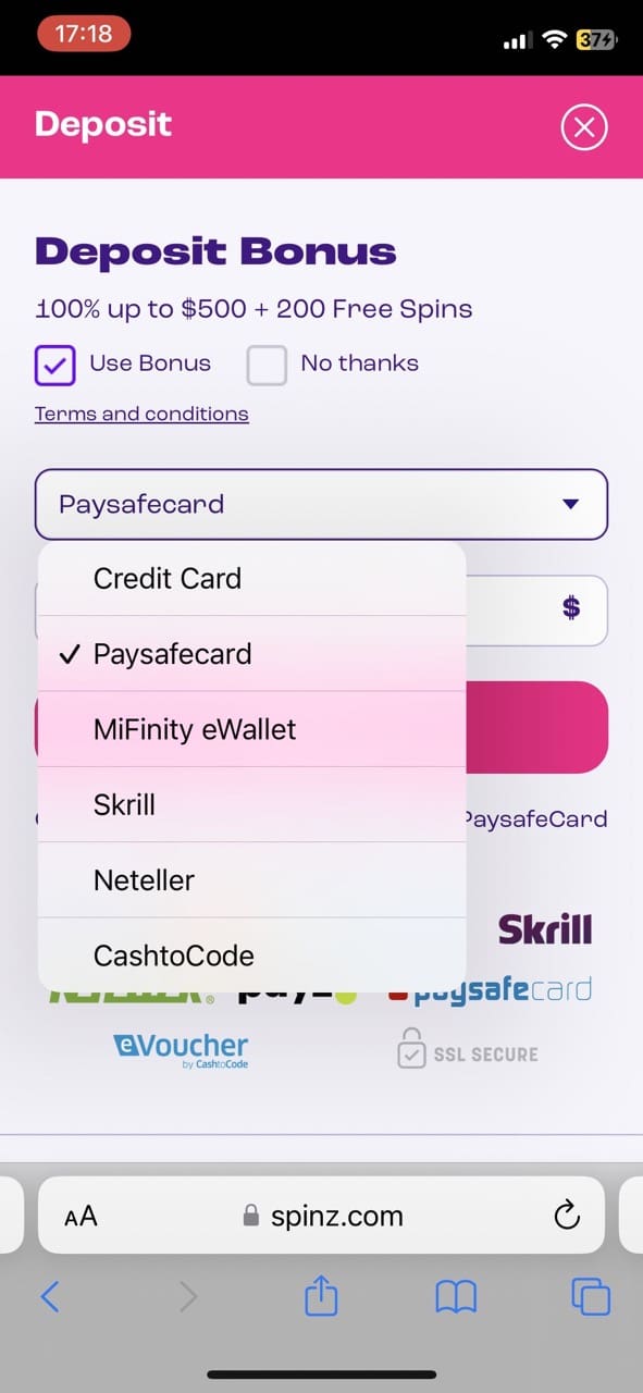 Spinz casino requires a minimum of 10 NZD to claim a welcome bonus. Once I filled out the sign up form and confirmed my email, I funded my account with 25 NZD using Paysafecard. Actually, Spinz has quite a long list of payment methods, which is a big pro. The money arrived instantly, and I ticked the box that I wanted to receive a welcome bonus. The welcome offer is lovely – 100% on the first deposit + 200 free spins which are spread over the next 8 days (basically 25 fs each day) 25 for 8 days. If you like vouchers, check our Paysafe casinos for more NZ sites that accept it.