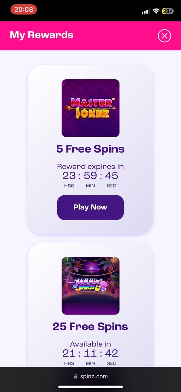 Spinz won’t compel you to scour coupon websites, but you will receive occasional seasonal Spinz bonus codes directly via email or SMS rather than on‑site — specific codes like “SPINZ25” or “RELOAD40” are not publicly listed. There isn’t an official Spinz no‑deposit bonus, but the minimum NZ $10 deposit required to unlock the welcome package functions as the closest equivalent, and daily rounds of Spinz free spins can stretch that ten‑dollar stake further than in most voucher‑style promos. In the general bonus overview on the site, it’s noted that “sometimes we send codes by email or SMS”, but you won’t find a permanent list of codes in the cashier.