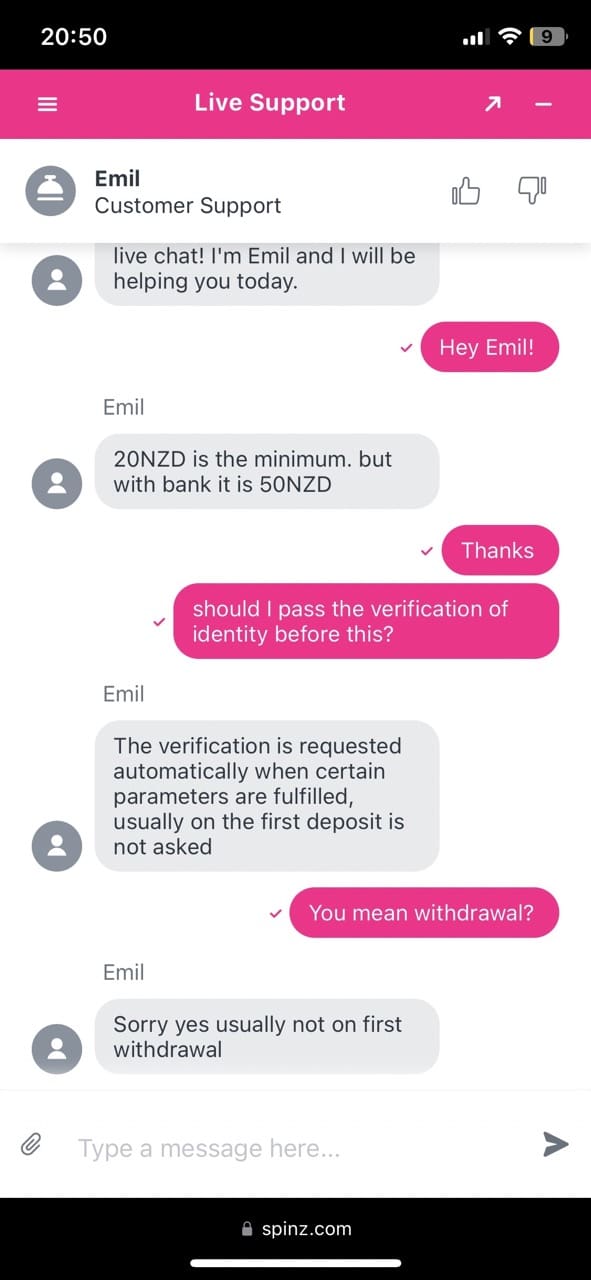 One thing I can’t forget to mention is responsible gambling measures. It seems like Spinz takes care of its members. While playing, I lost quite a bit of money. However, I was constantly receiving notifications about safety and responsible gambling. I actually didn’t opt to receive any notifications. Yet it was smart.