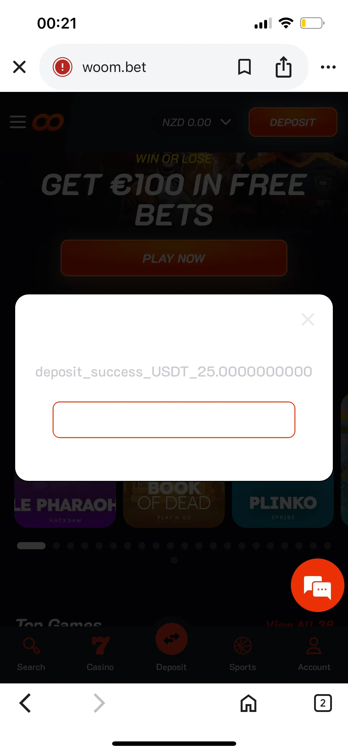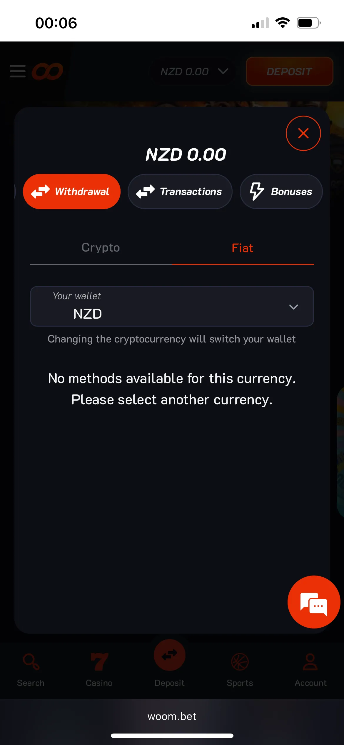 Registration was standard, plus Kiwi gamblers are given an option to log in via Google. As soon as I completed the registration, I navigated to the Deposit page and dropped 25 USDT via USDT TRC20 + paid a gas fee on the network of 1 USDT. The minimum deposit required to get a bonus at Woom Bet casino was 40 NZD, but as it turned out, my crypto deposit didn’t automatically convert to NZD. The casino has two separate accounts for fiat and cryptocurrency. However, some games require a NZD deposit, and the casino did convert my crypto deposit itself.